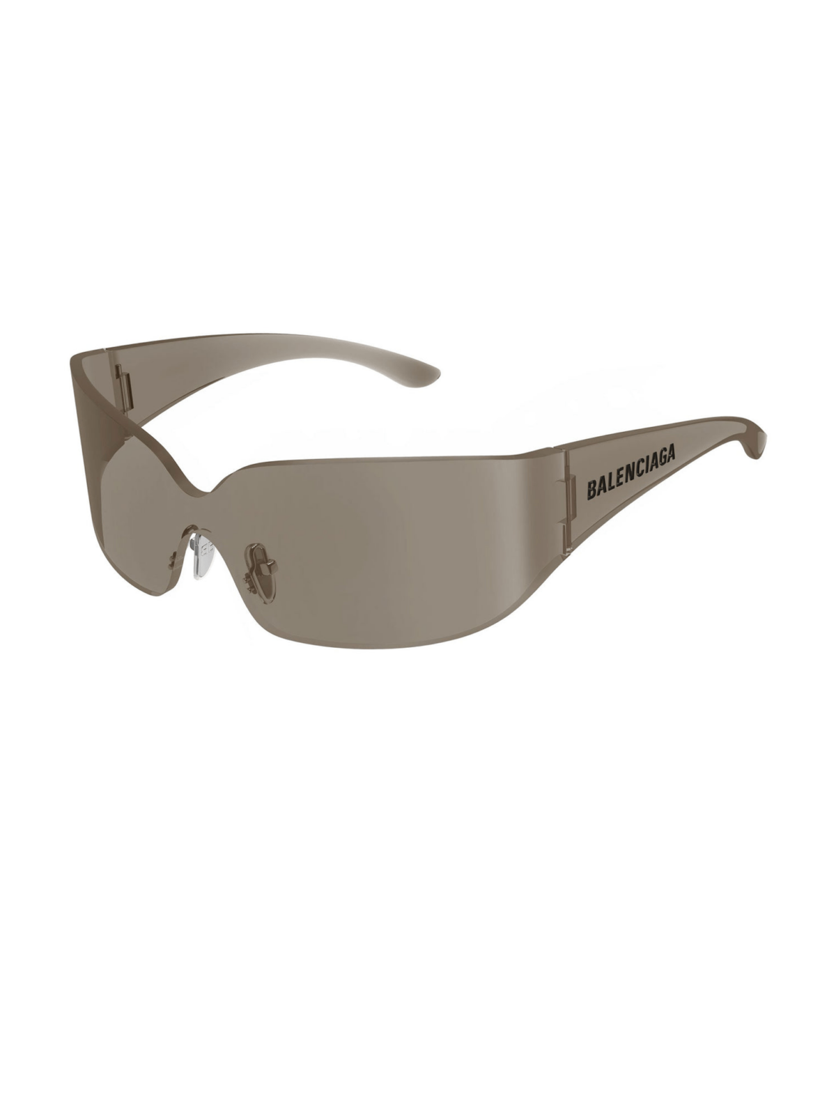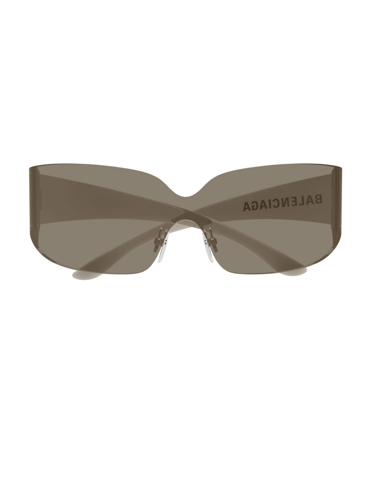 BALENCIAGA BB0412 001 - Модель має обтічний силует у стилі маски без оправи. Лінзи коричневого відтінку формують суцільну конструкцію, що переходить у широкі заушники. На боковій частині розміщений логотип BALENCIAGA чорного кольору.