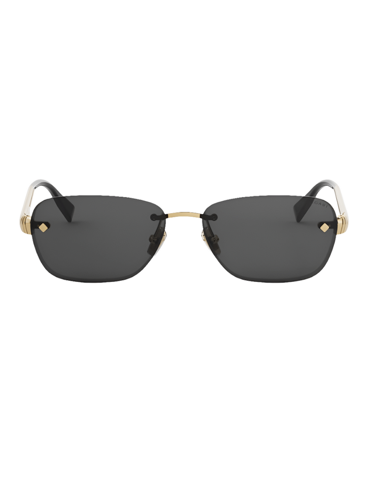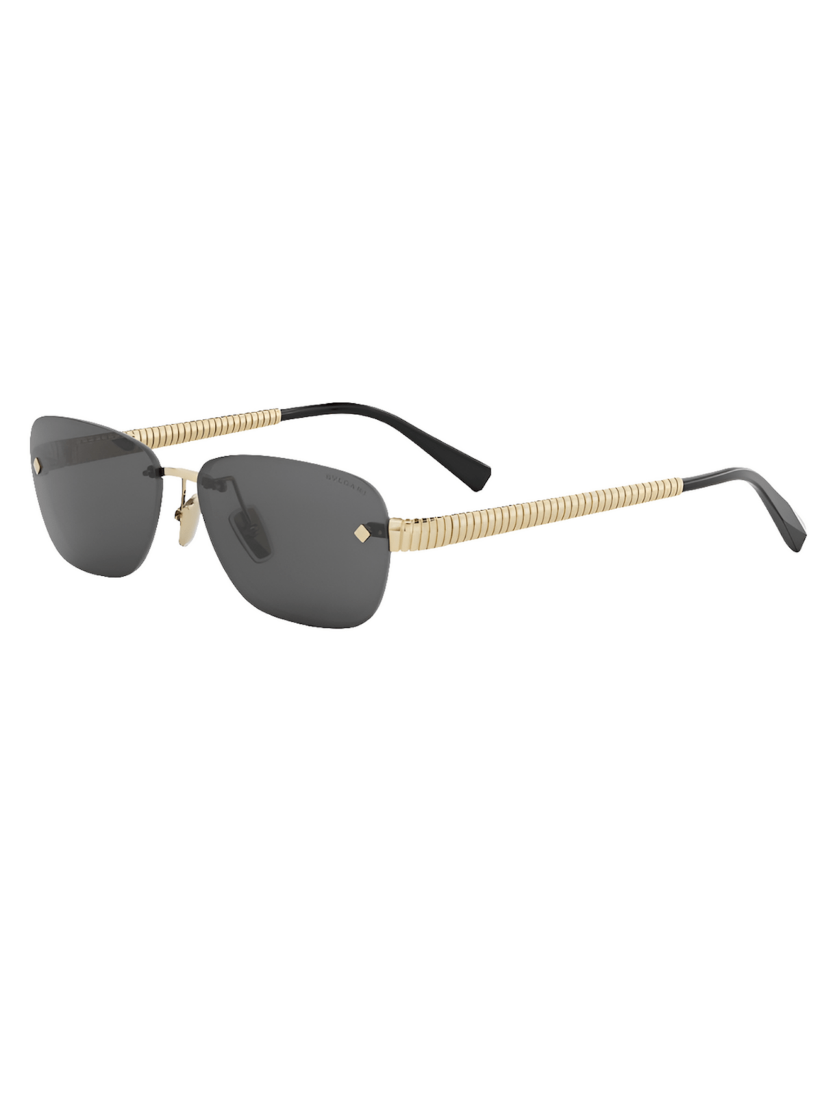 BVLGARI BV40057U 32A – солнцезащитные очки с безоправным силуэтом и декоративными элементами на скобках, линзы черного однотонного цвета, оправа выполнена из металла и имеет покрытие золота 24K.