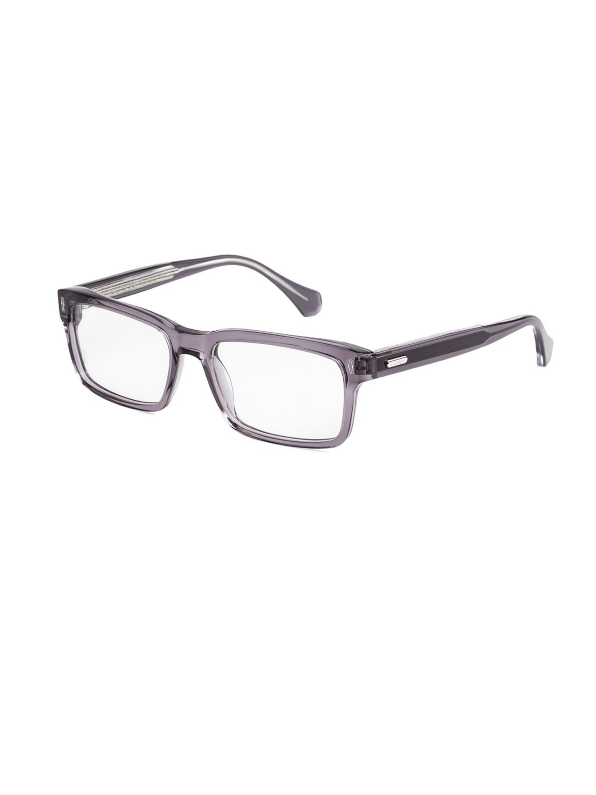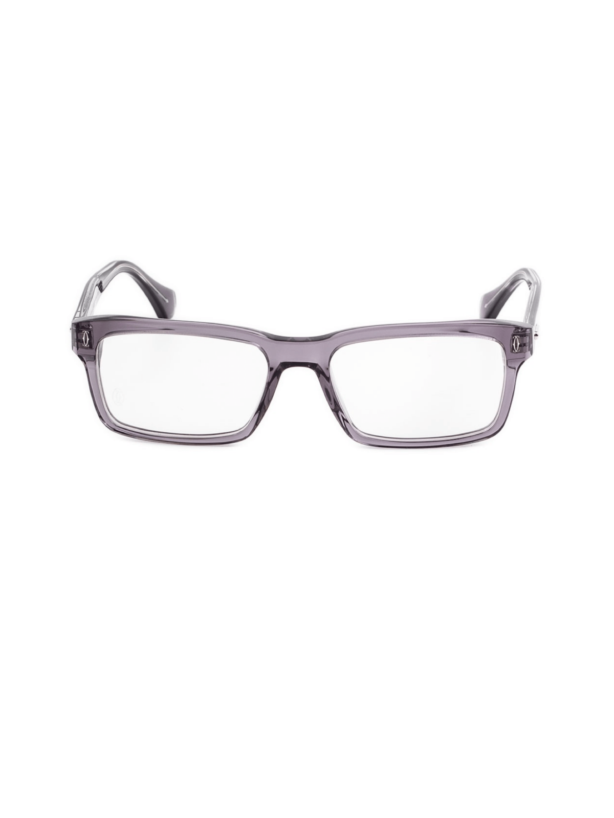 Прямокутна модель оправи від Cartier. Оправа виконана з напівпрозорого ацетату сірого кольору, з акцентом на дужках із металевими вставками.