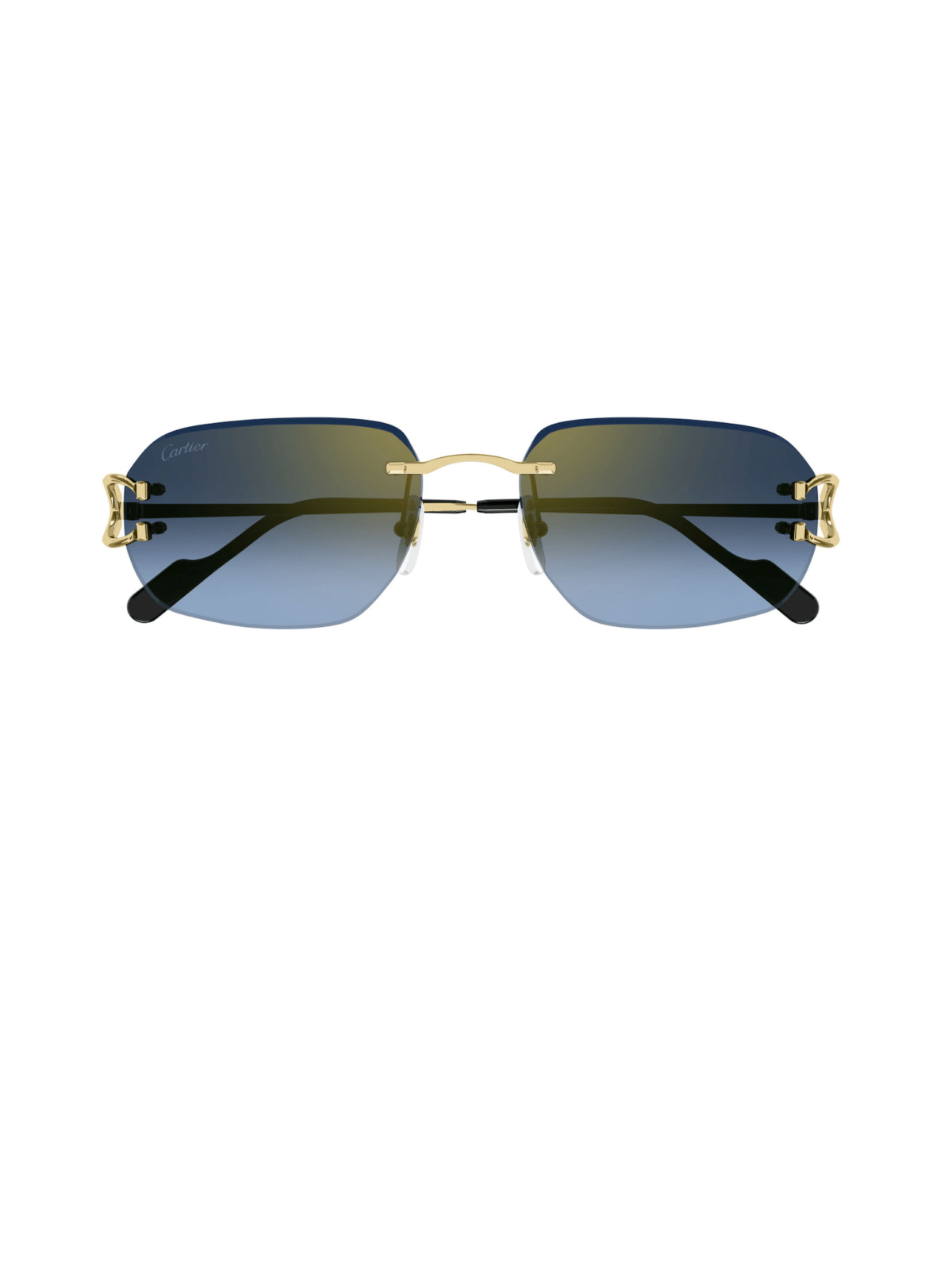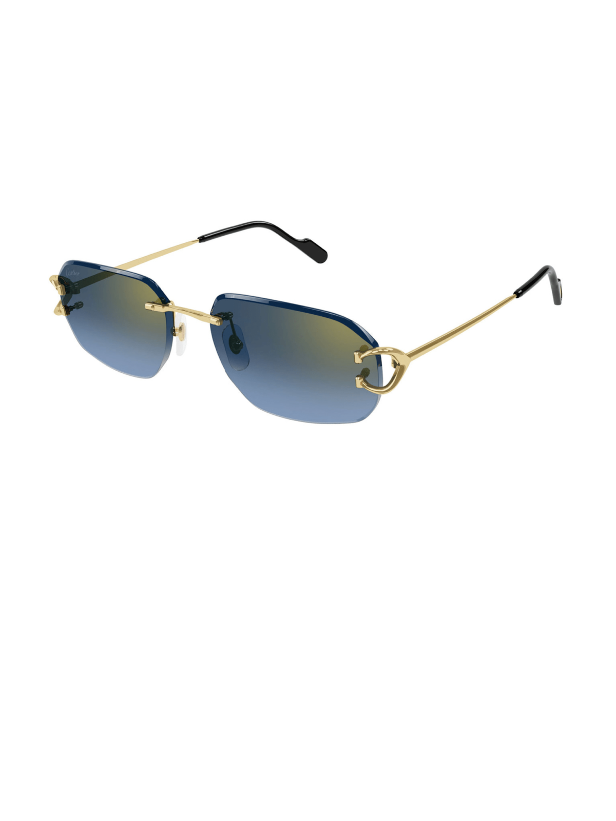 CARTIER CT0468S 002 - авіаторські металеві сонцезахисні окуляри з гладким золотим покриттям та золотими дужками. Прямі та тонкі дужки підкреслюють класичний авіаторський силует оправи, поєднуючи елегантність і мінімалізм. Лінзи з градієнтом синього та азурного відтінку з золотим блиском додають сучасний стильний акцент.
