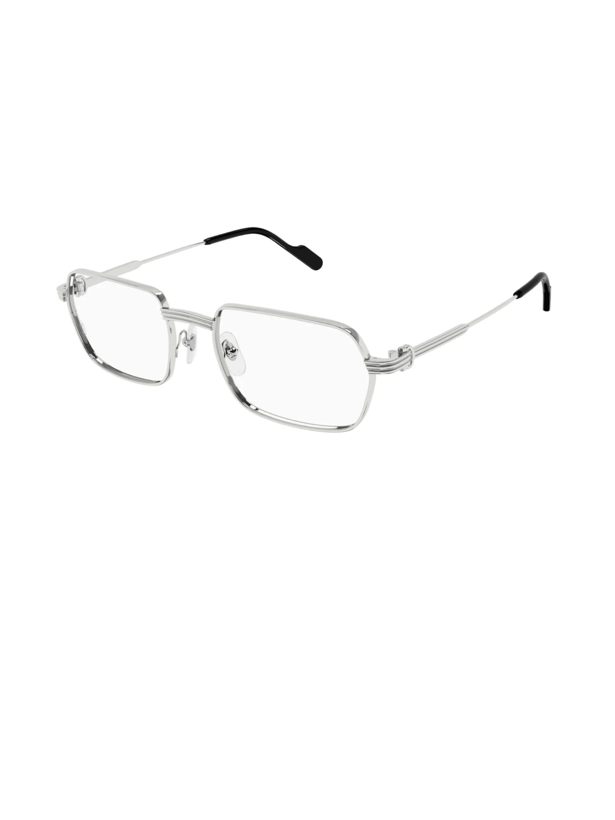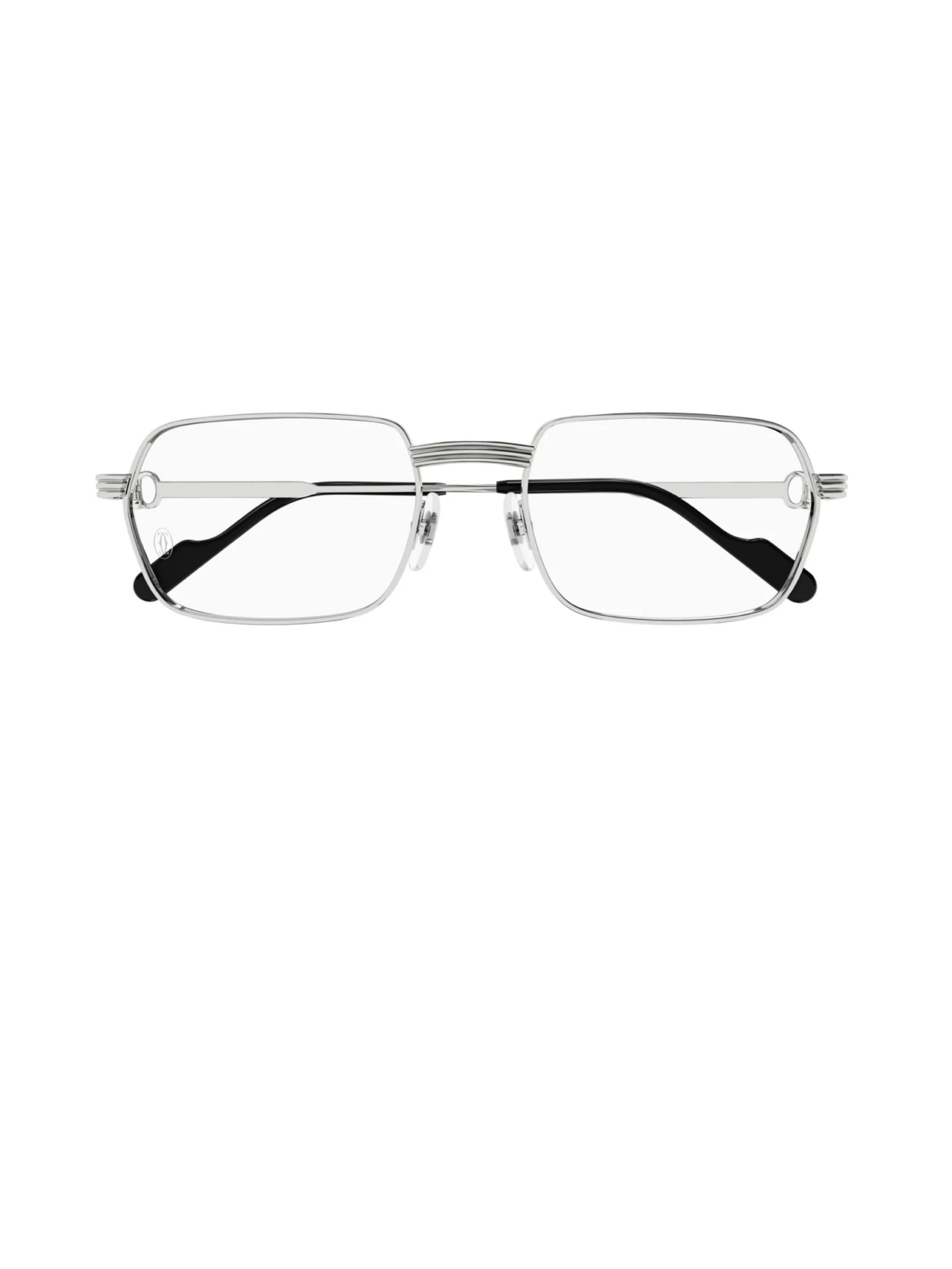 CARTIER CT0483S 002 -Модель має прямокутний силует із тонкою металевою оправою та платиновим покриттям з гладким покриттям. Дужки сріблясті, виконані з металу. Конструкція лаконічна та стримана, підкреслює характерну для Cartier точність ліній і преміальну обробку матеріалів.