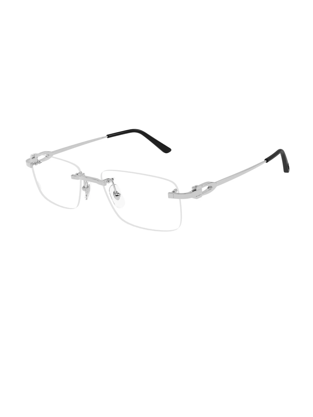 CARTIER CT0521O 002 - металева оправа прямокутної форми у гладкому платиновому покритті з дужками срібного кольору. Мінімалістичний силует підкреслює витонченість і технологічну точність бренду, поєднуючи лаконічний дизайн із фірмовою розкішшю Cartier.