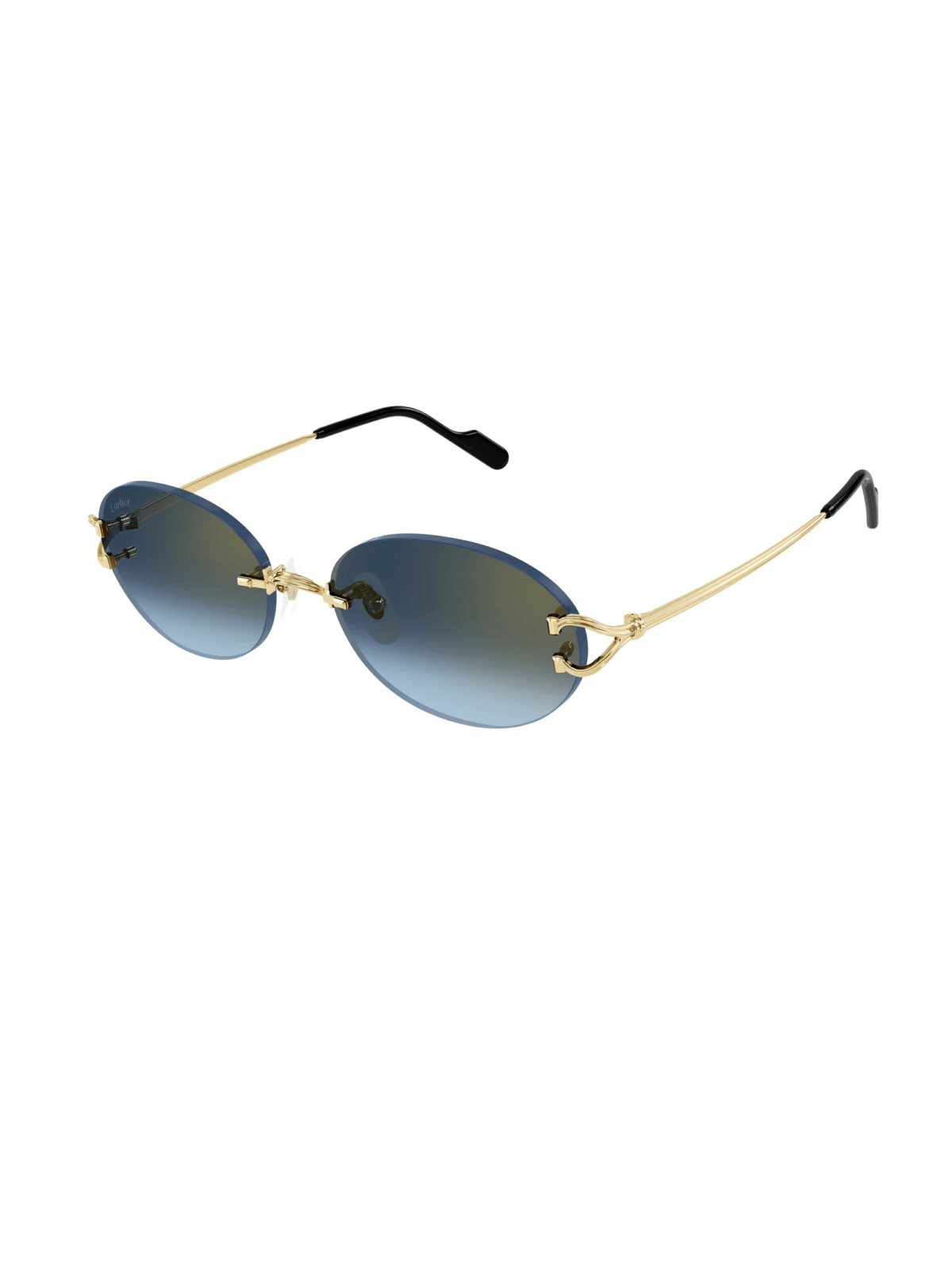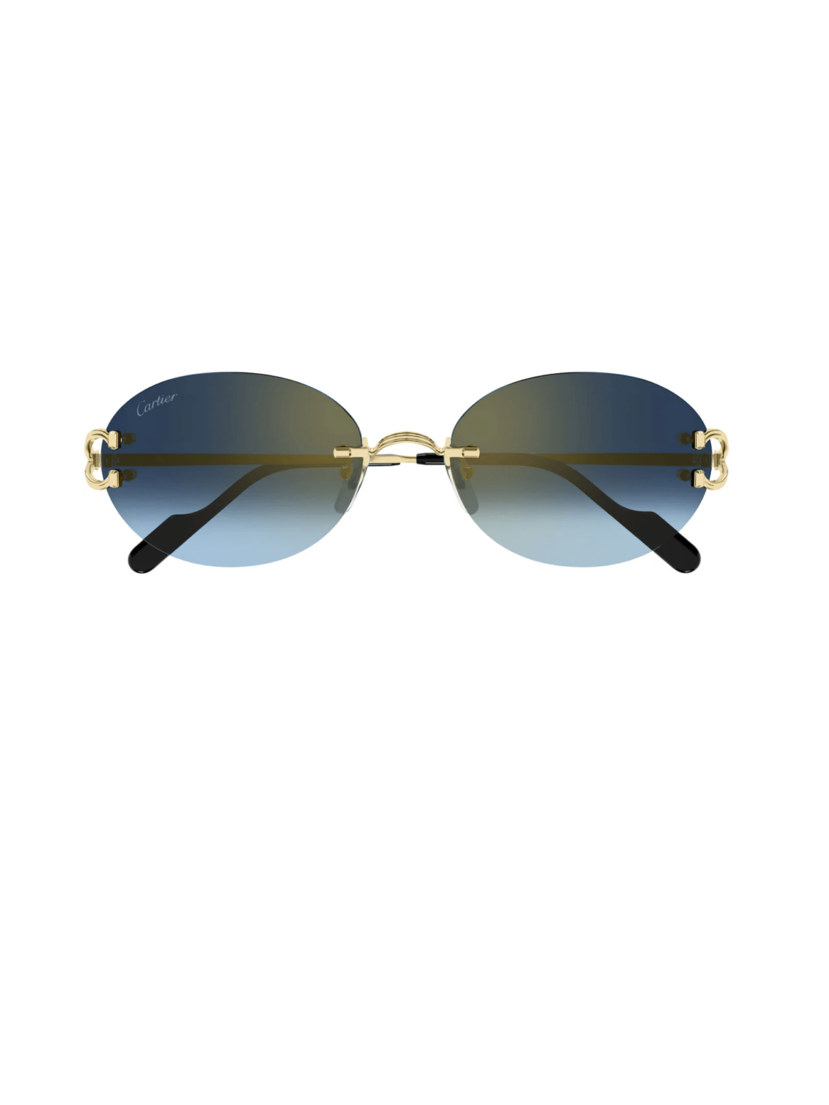 CARTIER CT0551S 002 - унісекс сонцезахисні окуляри з овальною металевою оправою в гладкому золотому покритті. Легкий силует із тонкими дужками поєднує класику та сучасний стиль. Лінзи з градієнтом синього й блакитного відтінків із золотим блиском створюють витончений і виразний акцент.