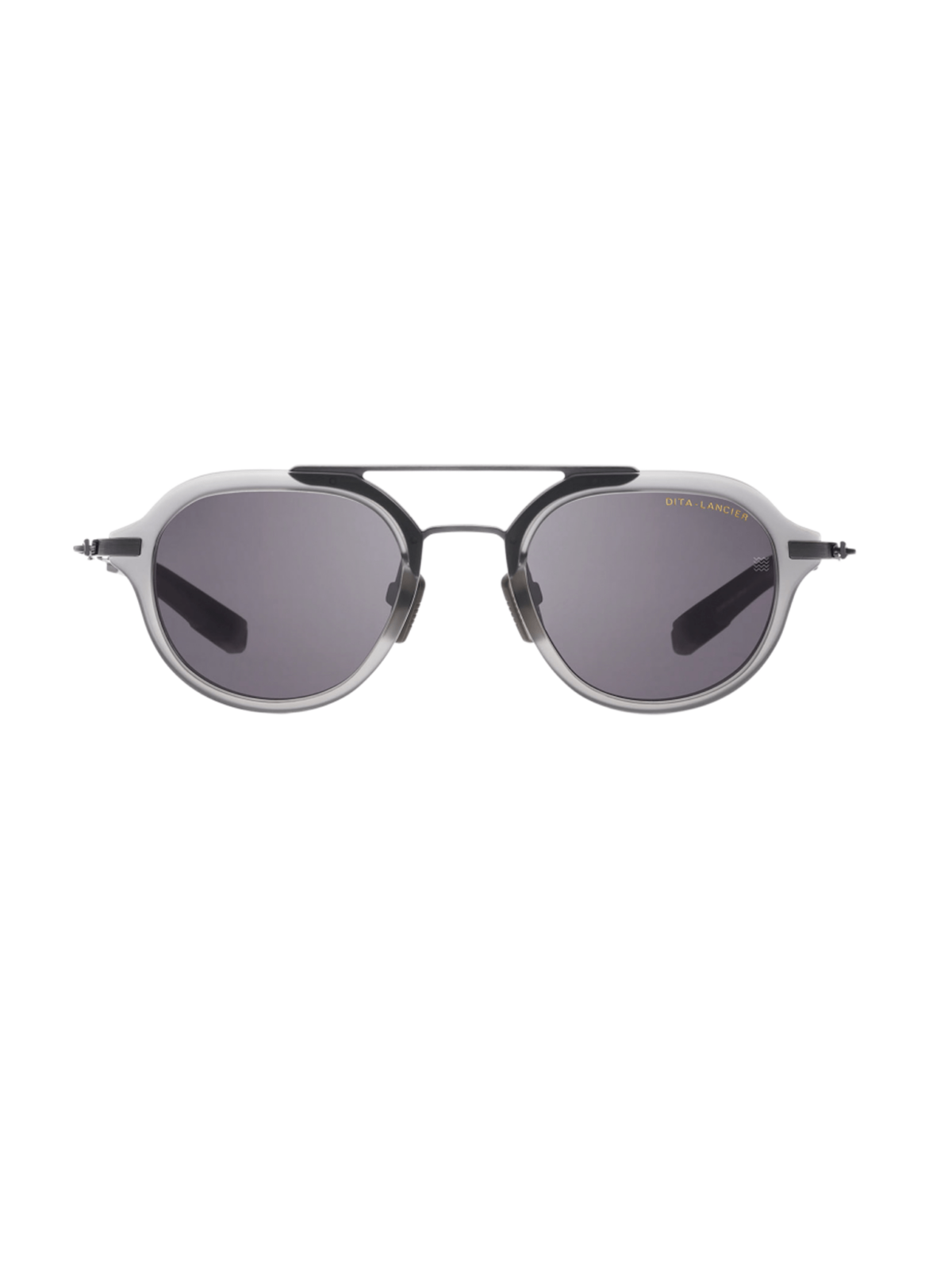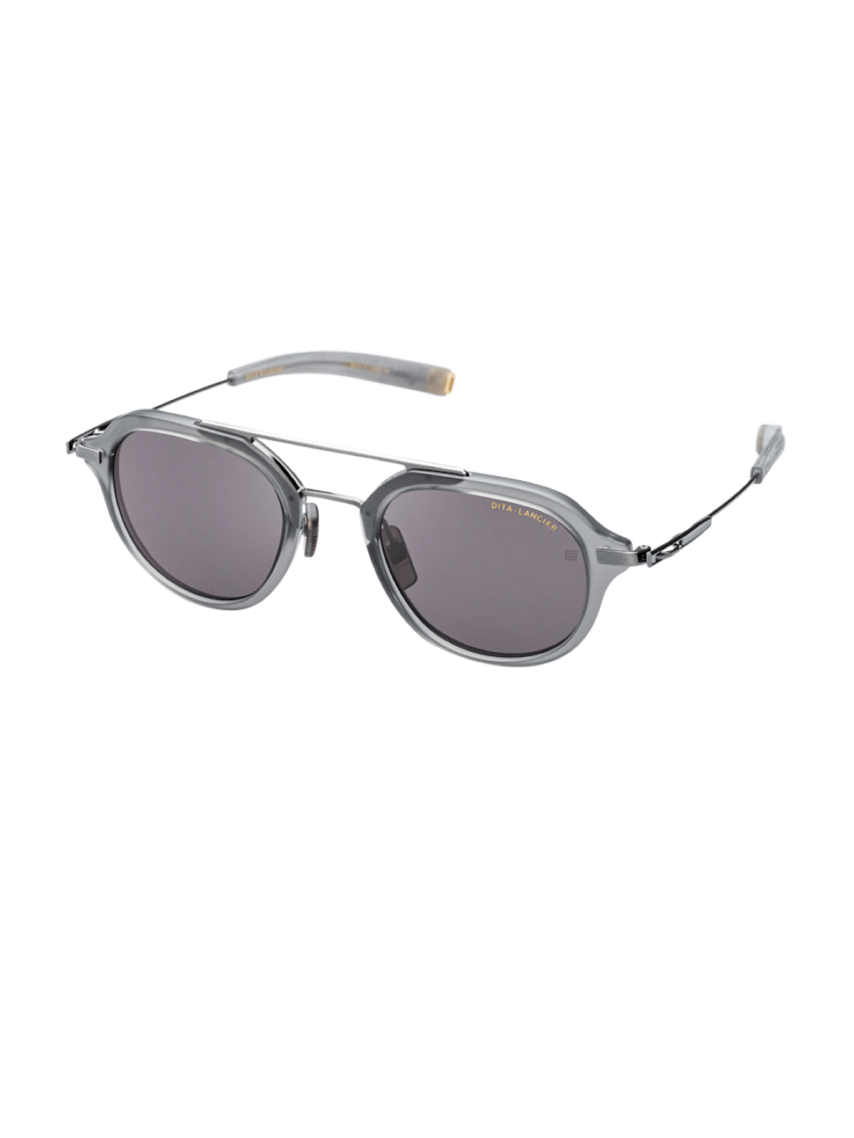 Модель має прямокутний, дещо об’ємний силует з елементами ацетату та титану. Оправа матово-кристально-сірого кольору з акцентом антик срібла. Лінзи — темно-сірі, з 100‑% захистом від UVA/UVB. Конструкція має потужні 3-барельні шарніри й титановий “hardware”, що підкреслює преміальний характер. Виготовлено в Японії.