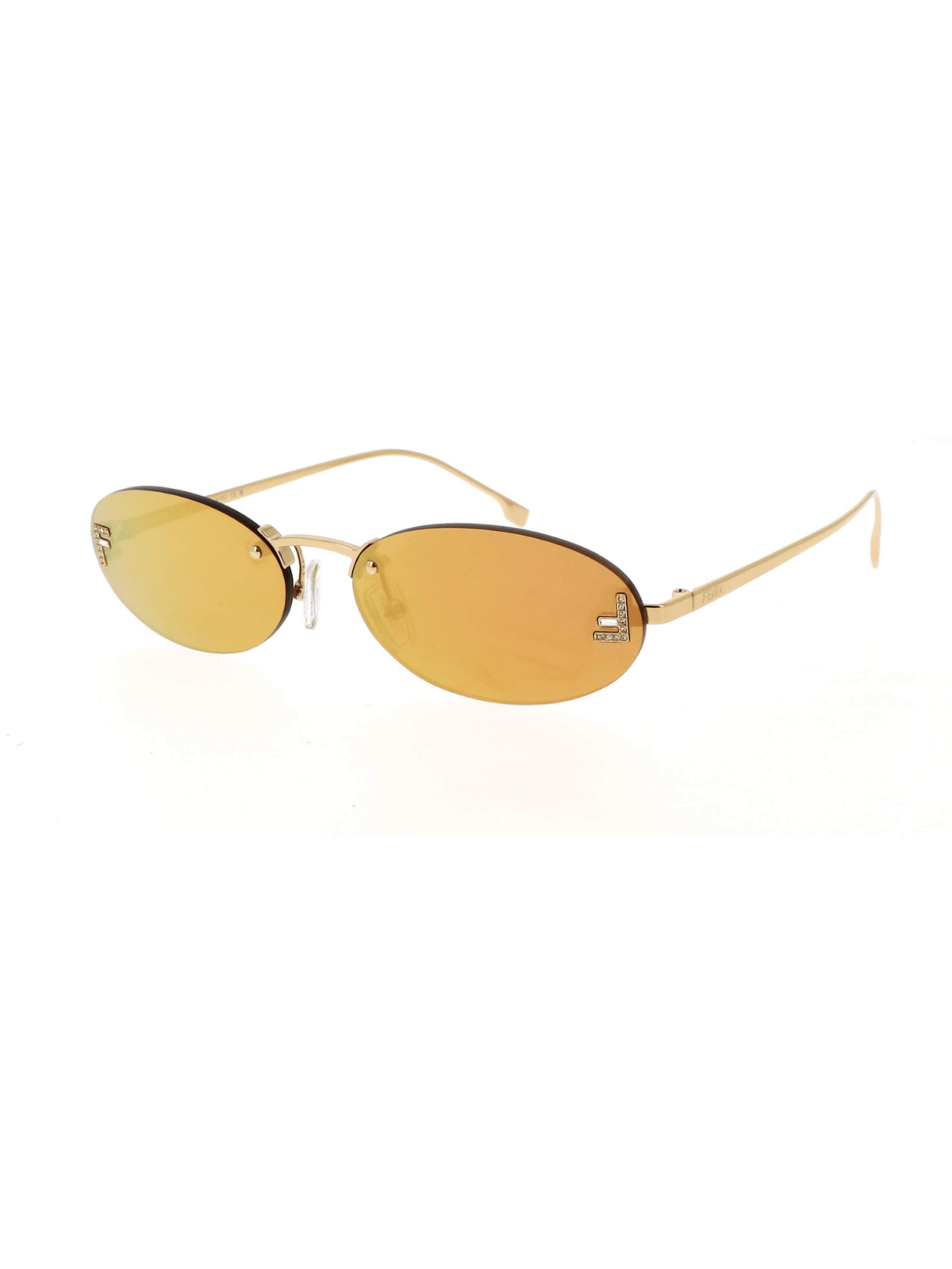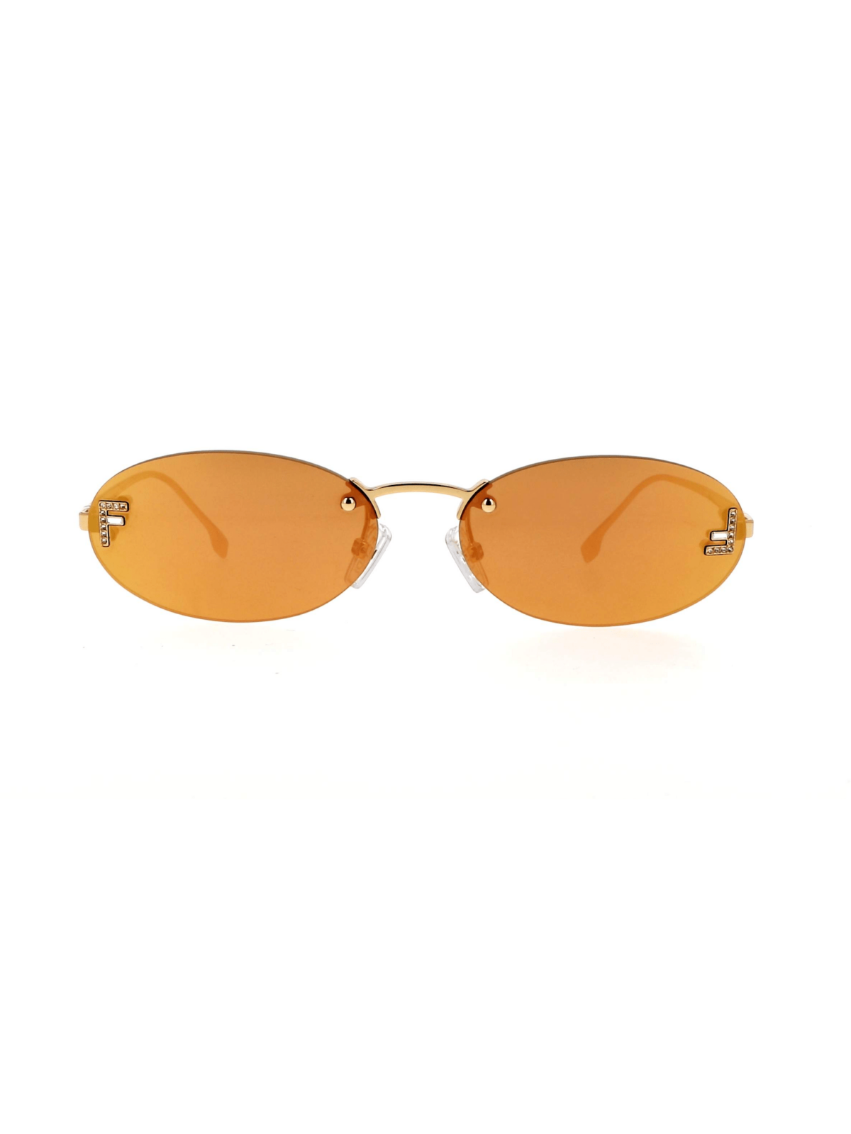 Хітова модель від FENDI, овальна форма в безоправному силуеті з металевими завушниками в золотому кольорі, з літерами F інструктованими камінцями з обох боків лінз, з помаранчевою дзеркальною лінзою.
