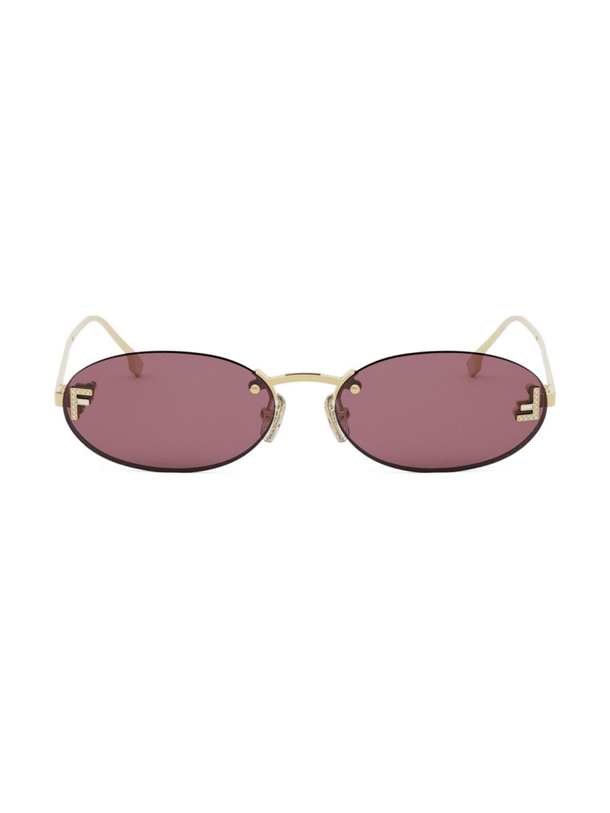 Хітова мода від FENDI, овальна форма в безоправному силі з металевими завушниками в золотому кольорі, з літерами F інструктованими камінцями з обох боків лінз, з бордовою лінзою.