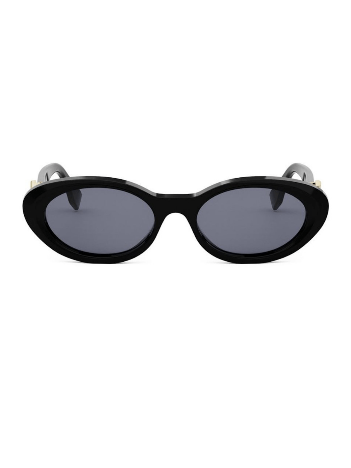 FENDI FE 40140U 01A – сонцезахисні окуляри із завуженим округлим силуетом Cat Eye, мають темно-сірі однотонні лінзи та оправу з ацетату глянсового чорного кольору з декоративним елементом на дужках.