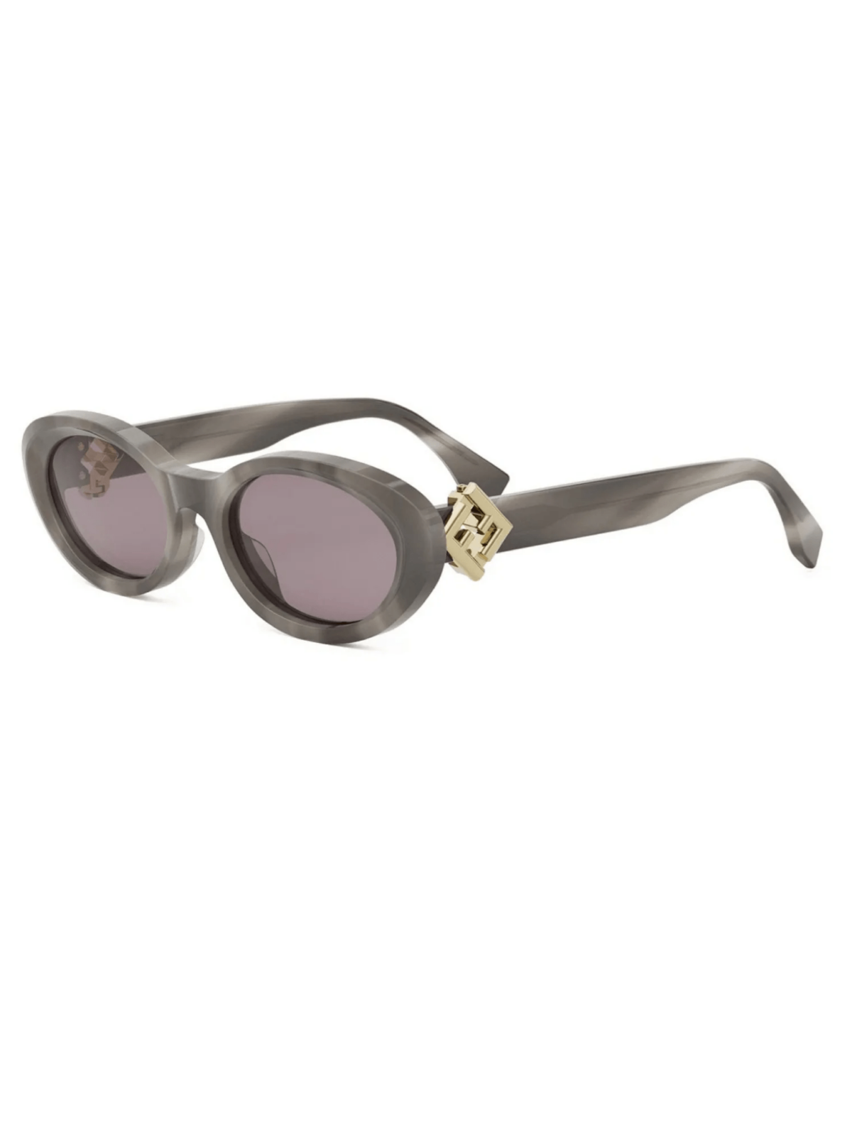 FENDI FE 40140U 57E – сонцезахисні окуляри із завуженим округлим силуетом Cat Eye, мають світло-фіолетові однотонні лінзи та оправу з ацетату глянсового сірого кольору з декоративним елементом на дужках.