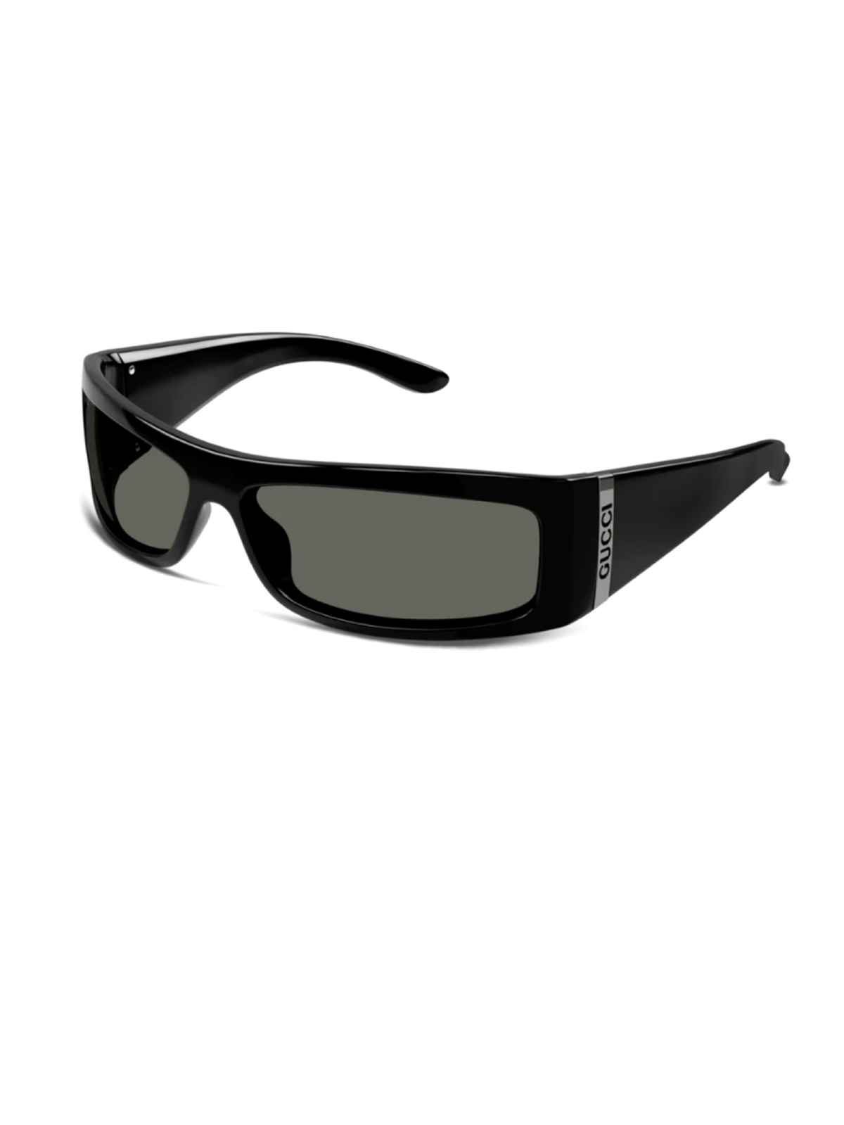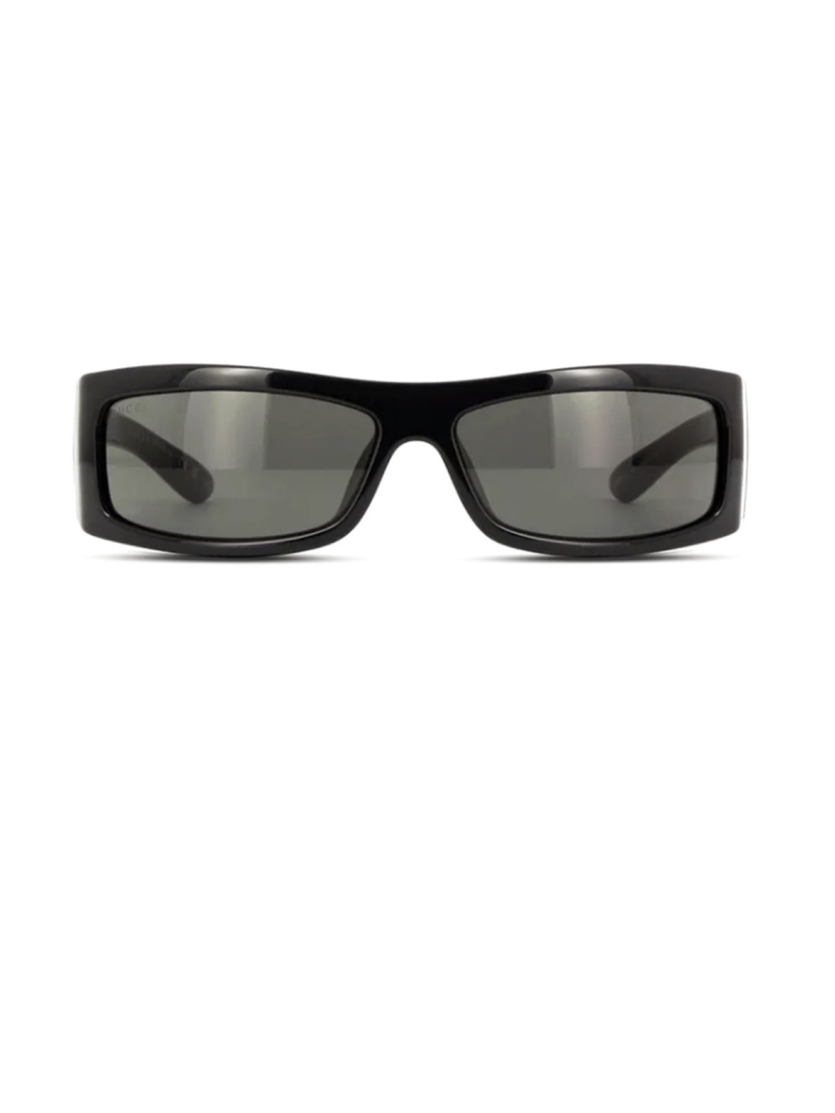 Модель у формі прямокутної маски від Gucci, в чорному кольорі оправи з сірою лінзою.