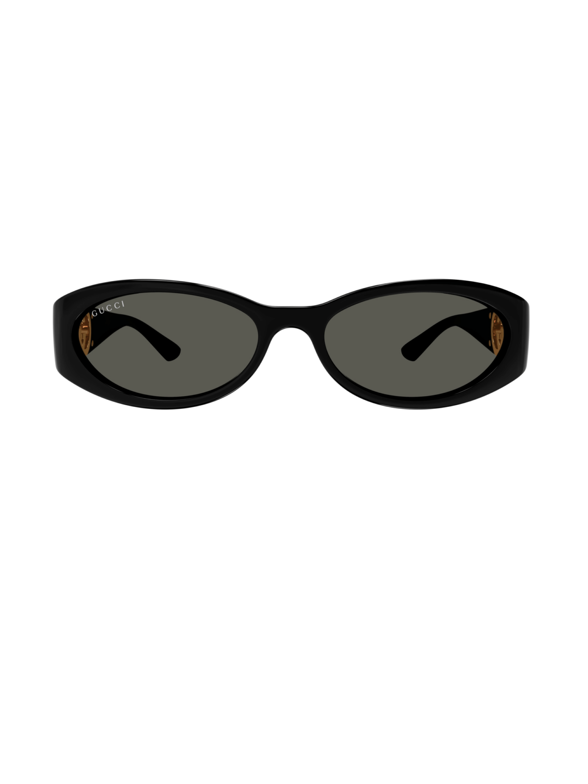 Модель у формі обтікаючого овалу в ретро стилі, з акцентними, золотими лого на дужках, в чорному кольорі з сірою лінзою.