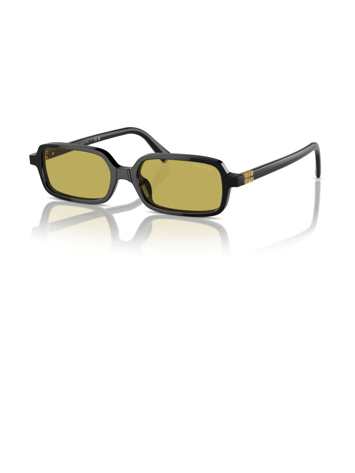 Хіт від бренду Miu Miu прямокутної форми, в чорному кольорі оправи з жовтою лінзою.