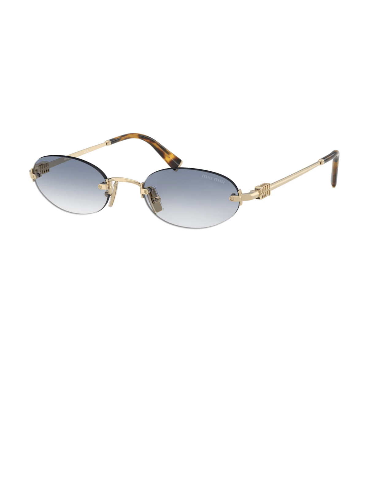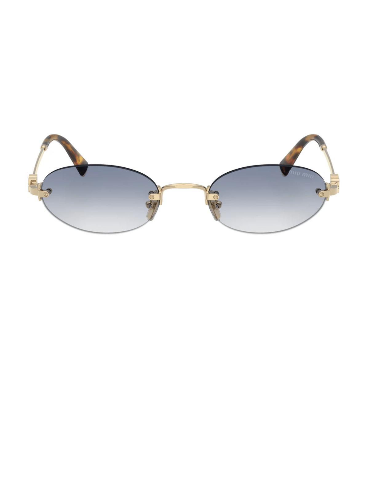Модель має безобідковий овальний силует з плавними обрисами. Оправа виконана з металу у відтінку золото. Лінзи градієнтно-синього кольору, що створює легкий тоновий перехід. Дужки тонкі, із мінімальним декоративним акцентом.