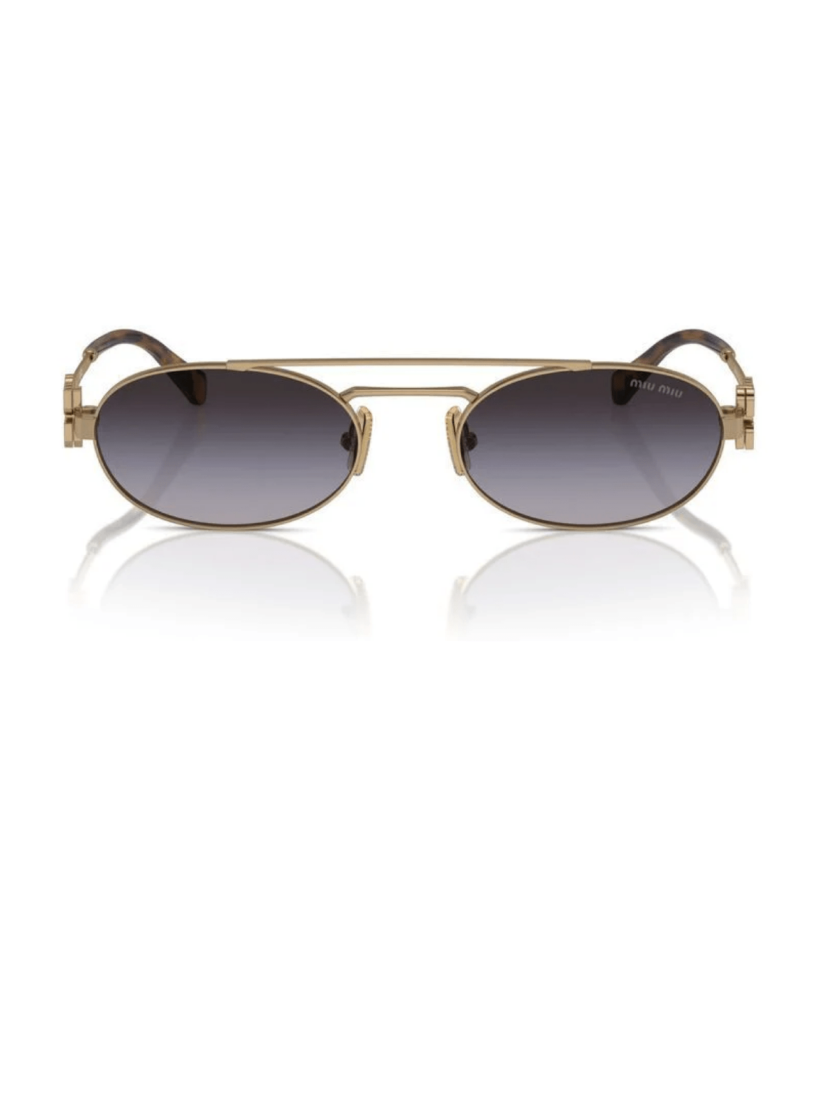 Модель от Miu Miu овальной формы, в металлической оправе золотого цвета с серой, градиентной линзой, с двойным мостиком на переносице.