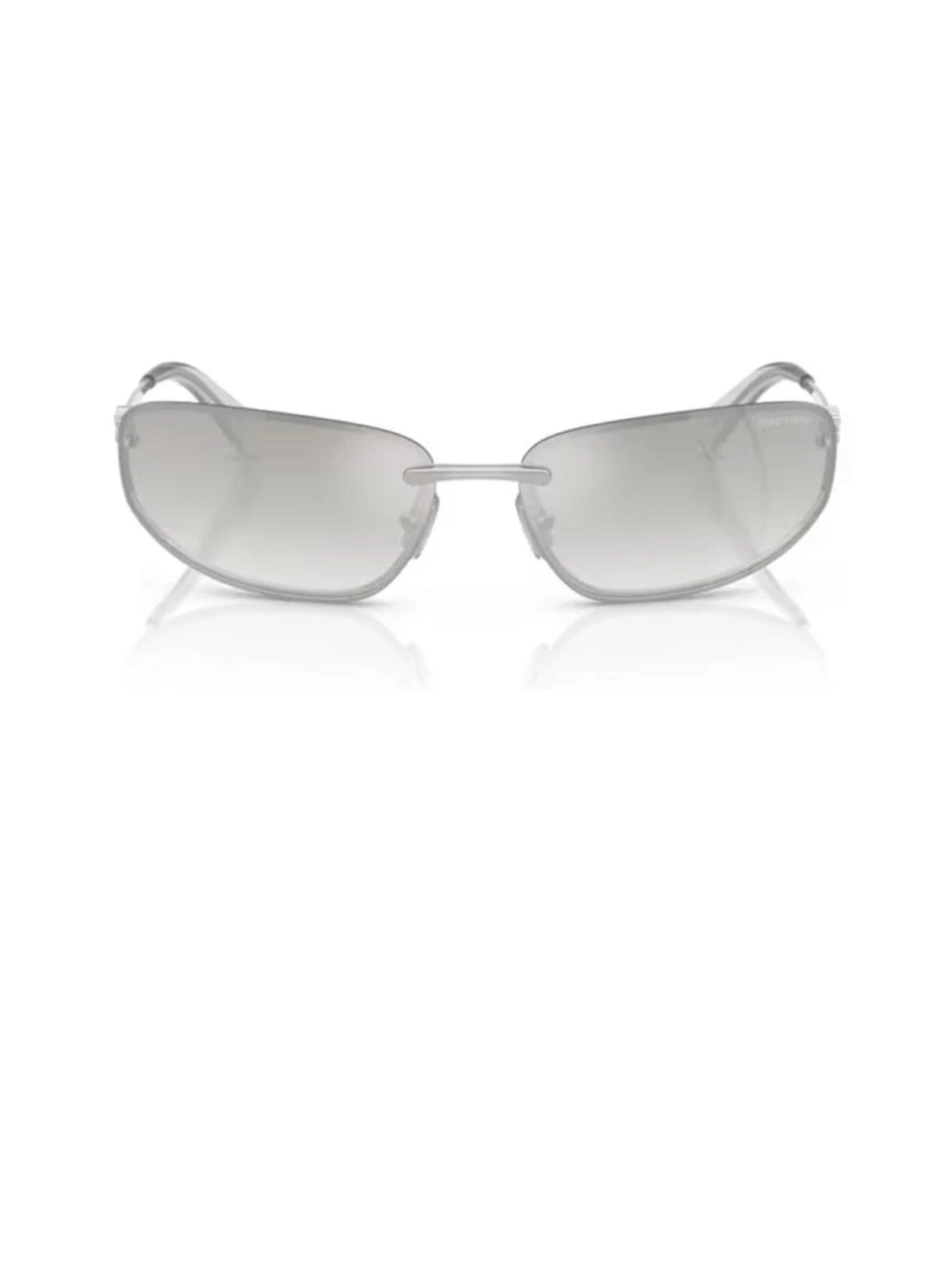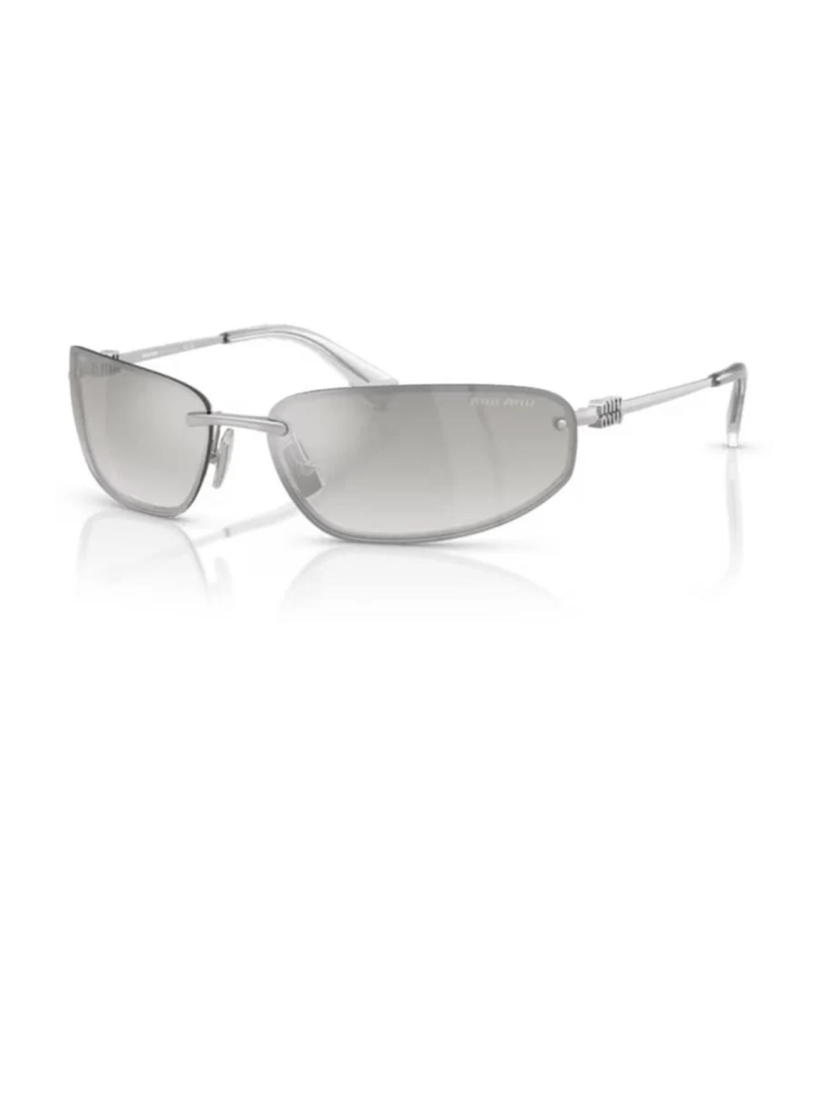 Модель у формі маски від Miu Miu, з напівпрозорою, градієнтною лінзою в срібній оправі.