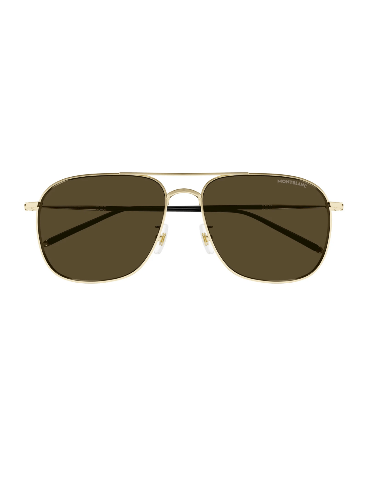 Класична модель Montblanc із силуетом авіатора у металевый оправі золотого кольору, з силіконовими чорними завушниками та коричневою лінзою.