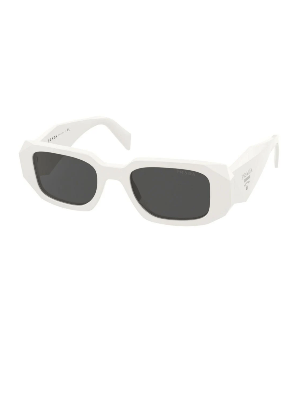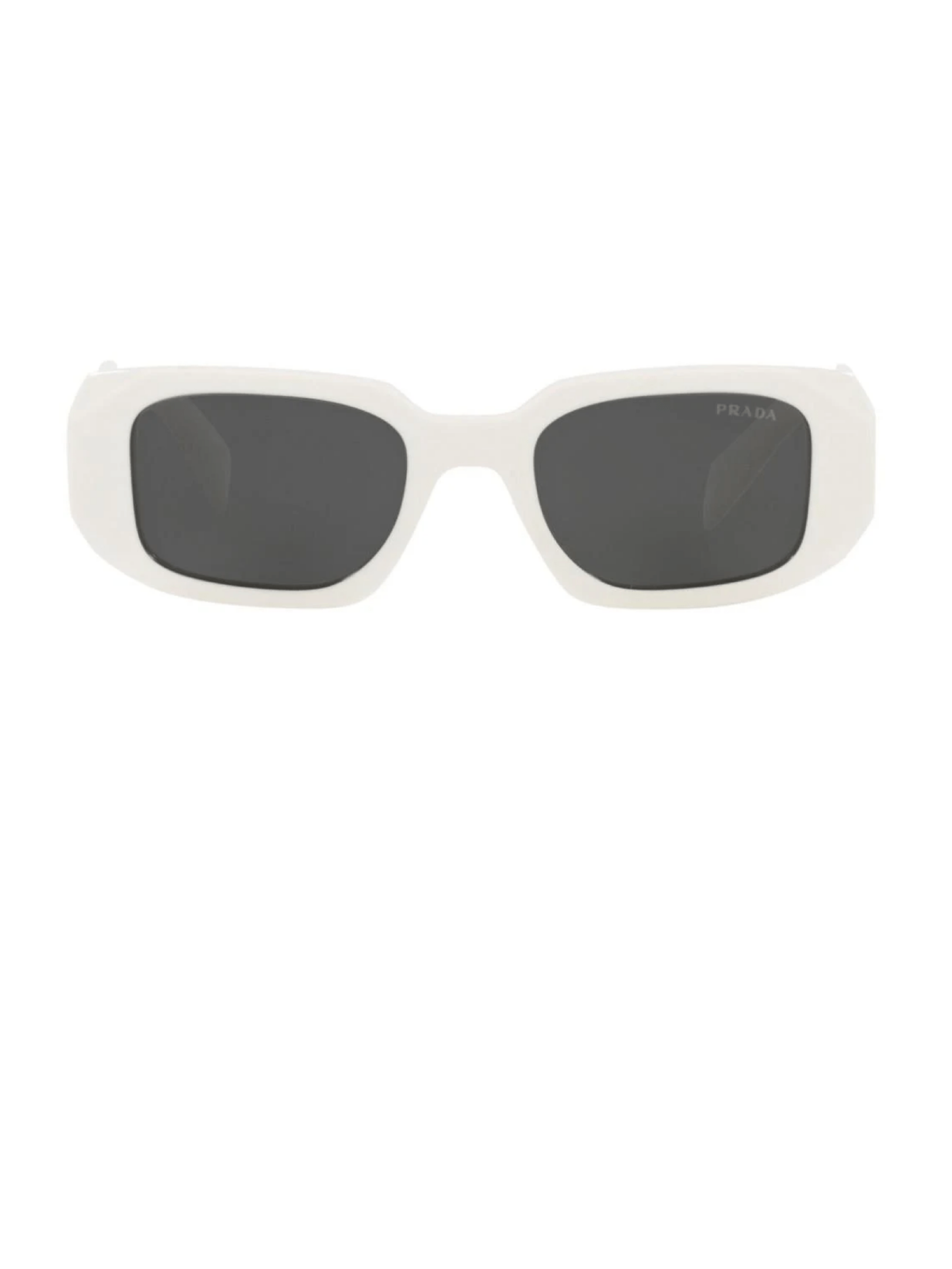 Хітова та універсальна модель від Prada, в прямокутному силуеті, в білому кольорі оправи з сірою лінзою.