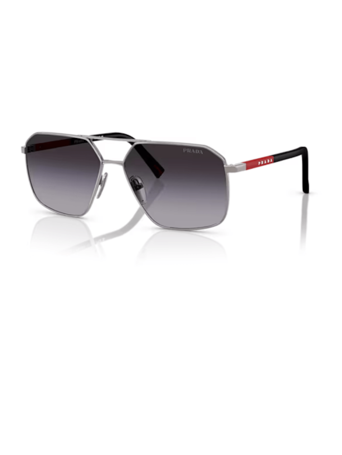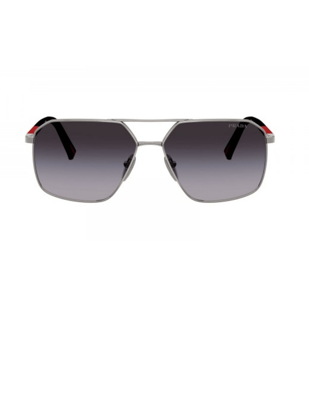 Модель має силует авіатор — поєднання квадратної/геометричної форми з двома мостиками. Оправа виготовлена з металу в срібному виконанні. Лінзи темно-сірі, з градієнтом. Дужки — тонкі металеві з червоними акцентами та логотипом Prada.