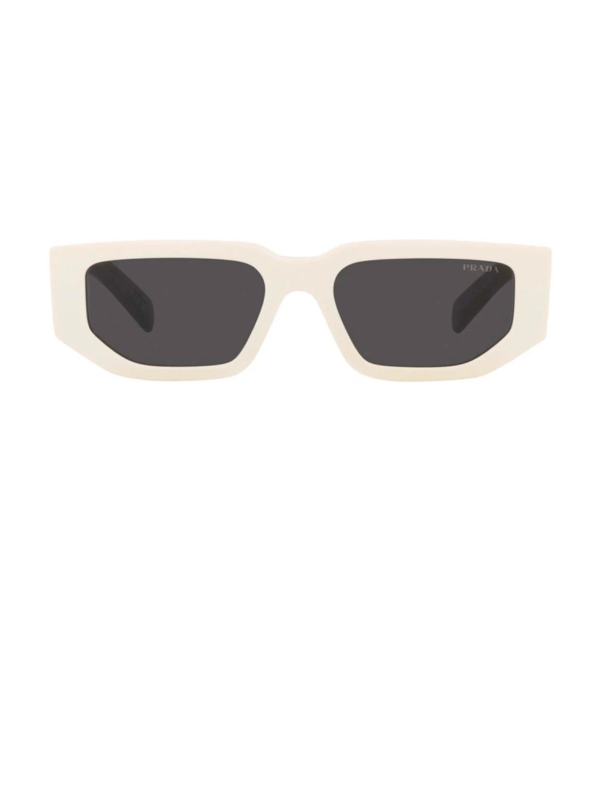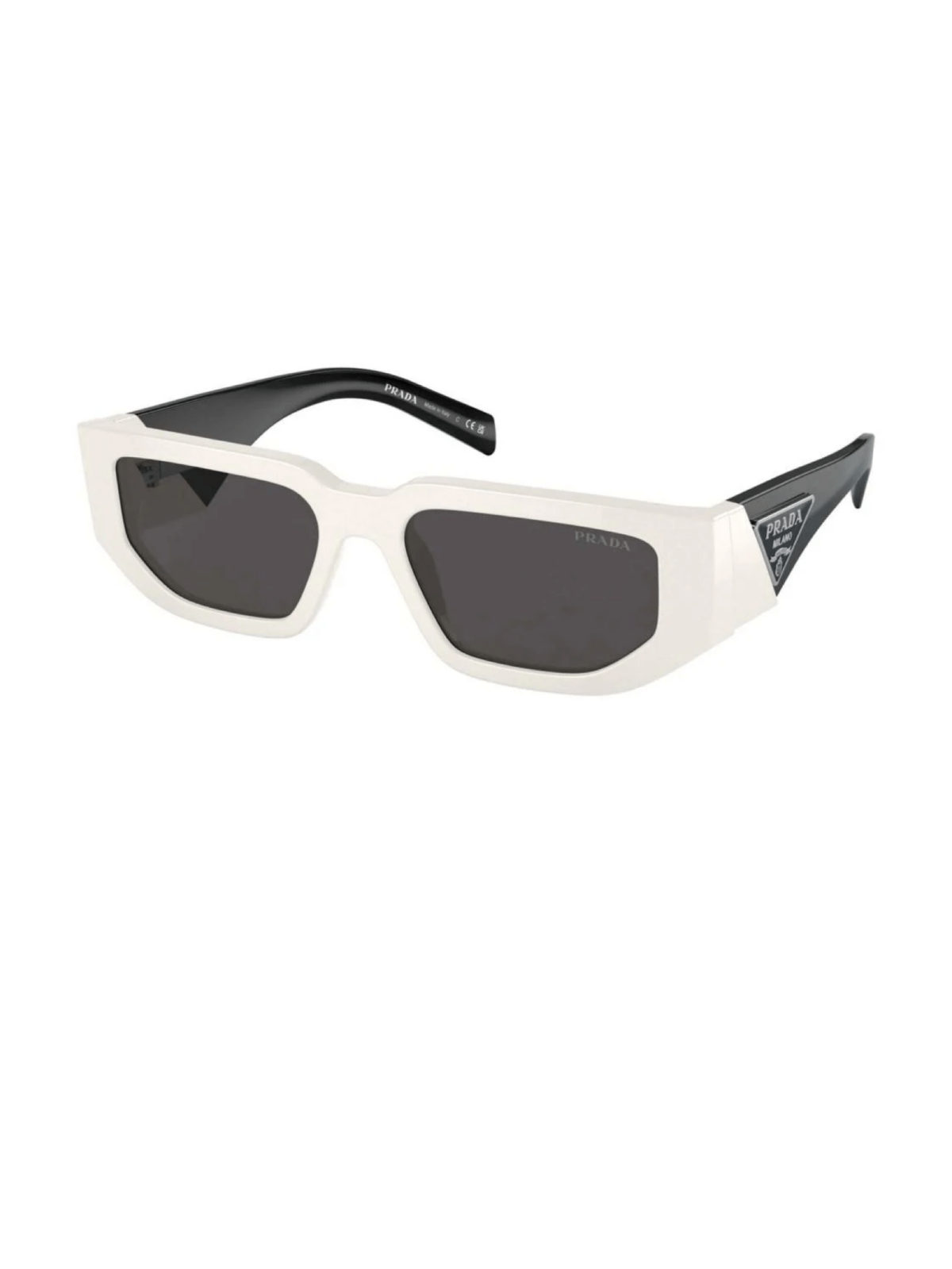 Модель в прямокутному силуеті, з об'ємними дужками з лого бренду з обох боків. Оправа в чорно-білому кольорі з сірою лінзою.