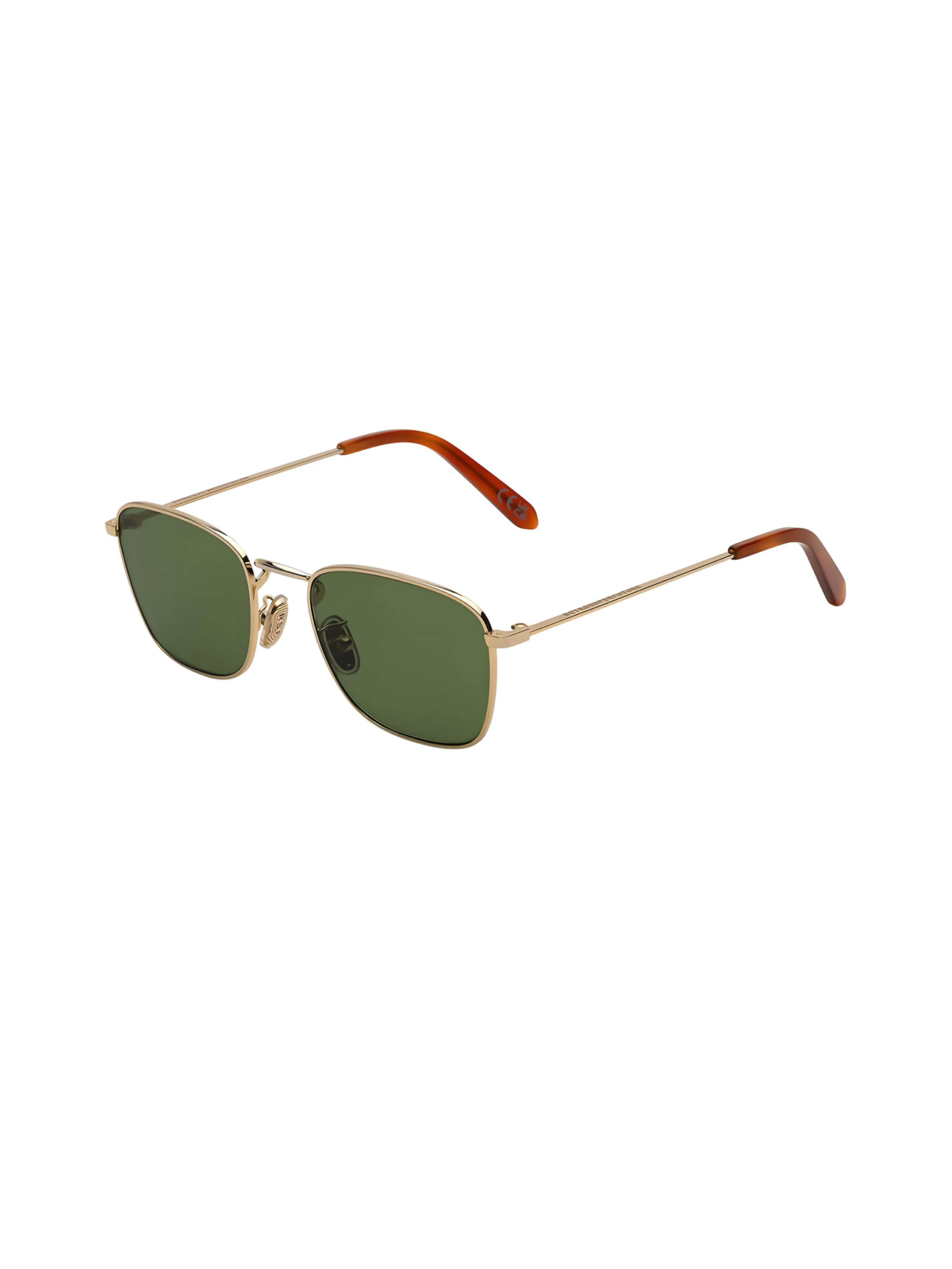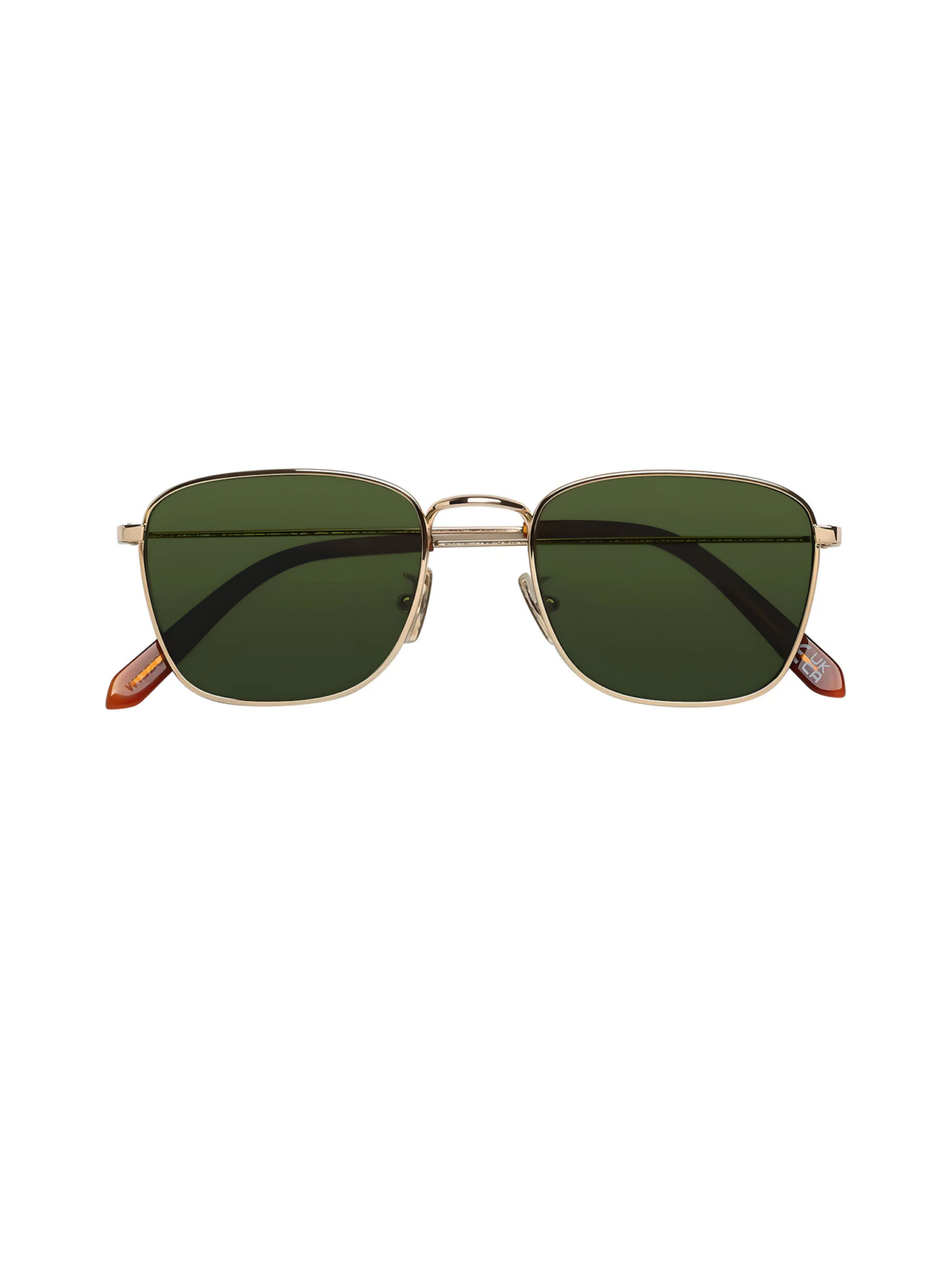 Універсальні сонцезахисні окуляри з легким металевим каркасом та чіткими квадратними лінзами. У цій версії золотиста металева оправа поєднується з класично зеленими гартованими скляними лінзами, що створюють природний, м’який контраст та естетику modern classic. Наконечники дужок обшиті комфортним ацетатом для кращої посадки за вухами.