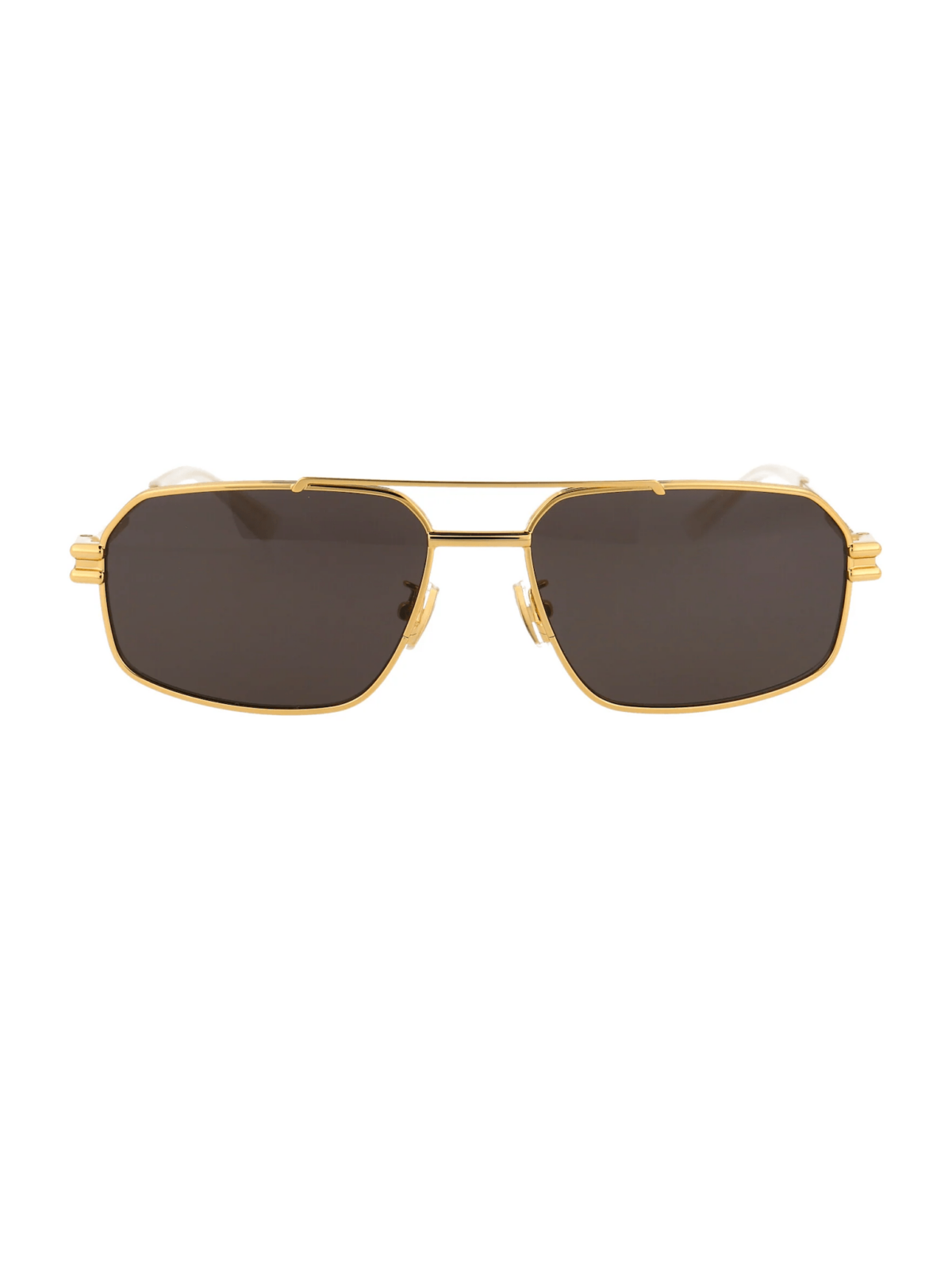 Модель имеет силуэт авиатора с прямыми линзами и скругленными углами, выполненный в формате тонкой металлической оправы. Цвет – глянцевое золото. Конструкция – двойная перемычка, регулируемые носовые упоры, тонкие металлические скобки с фирменным узловым элементом на шарнире. Линзы темно-серые, сплошные, с полной UV-защитой.