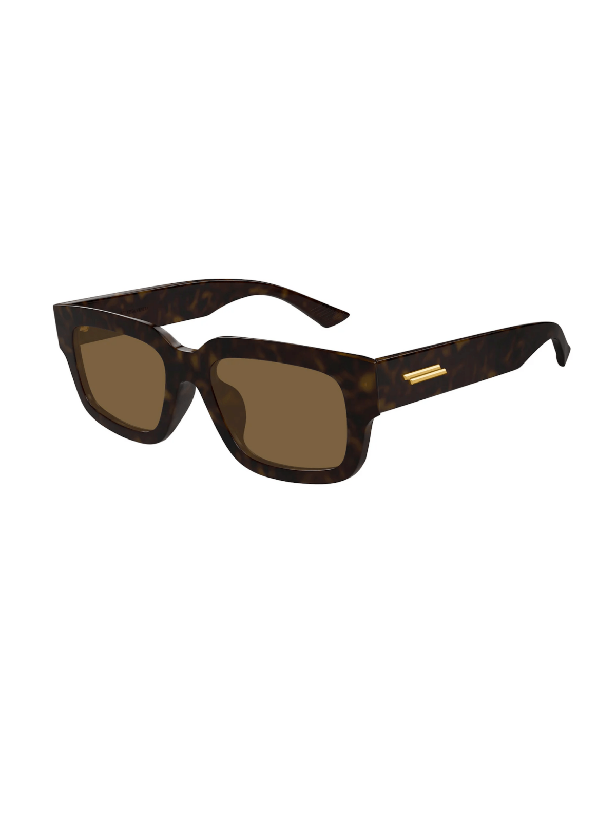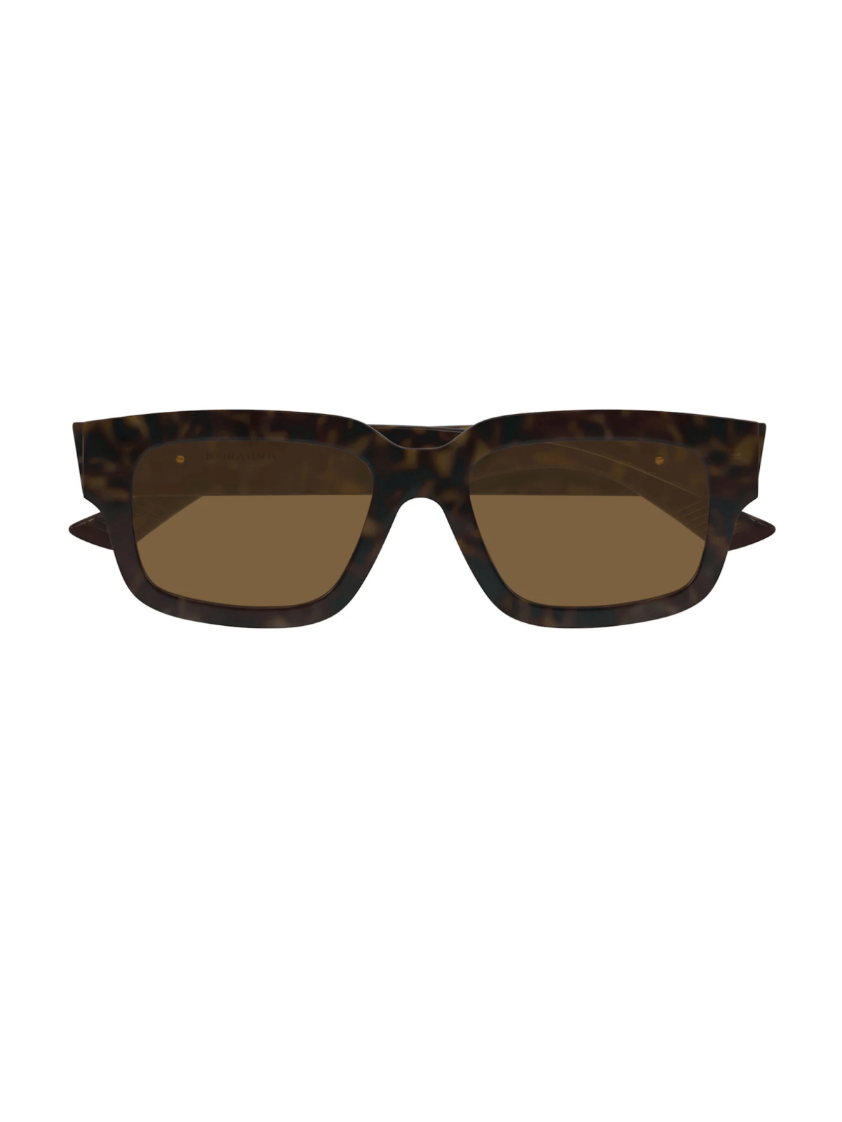 Модель имеет прямоугольный силуэт с четко выраженными углами. Оправа изготовлена ​​из ацетата рогового цвета, толстые передние элементы уменьшаются до более тонких профилей сверху. Линзы коричневог оттенка, однотонные.