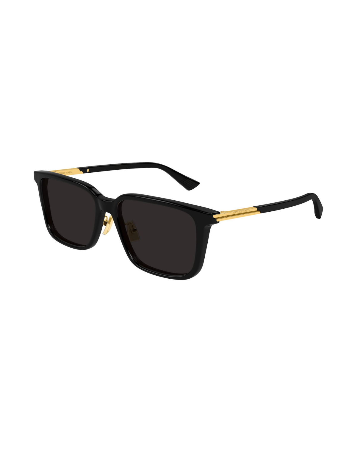 Модель имеет квадратный силуэт с прямыми линиями и четким контуром. Оправа сочетает в себе черный ацетат с золотистыми металлическими элементами. Линзы темно-серые однотонные.