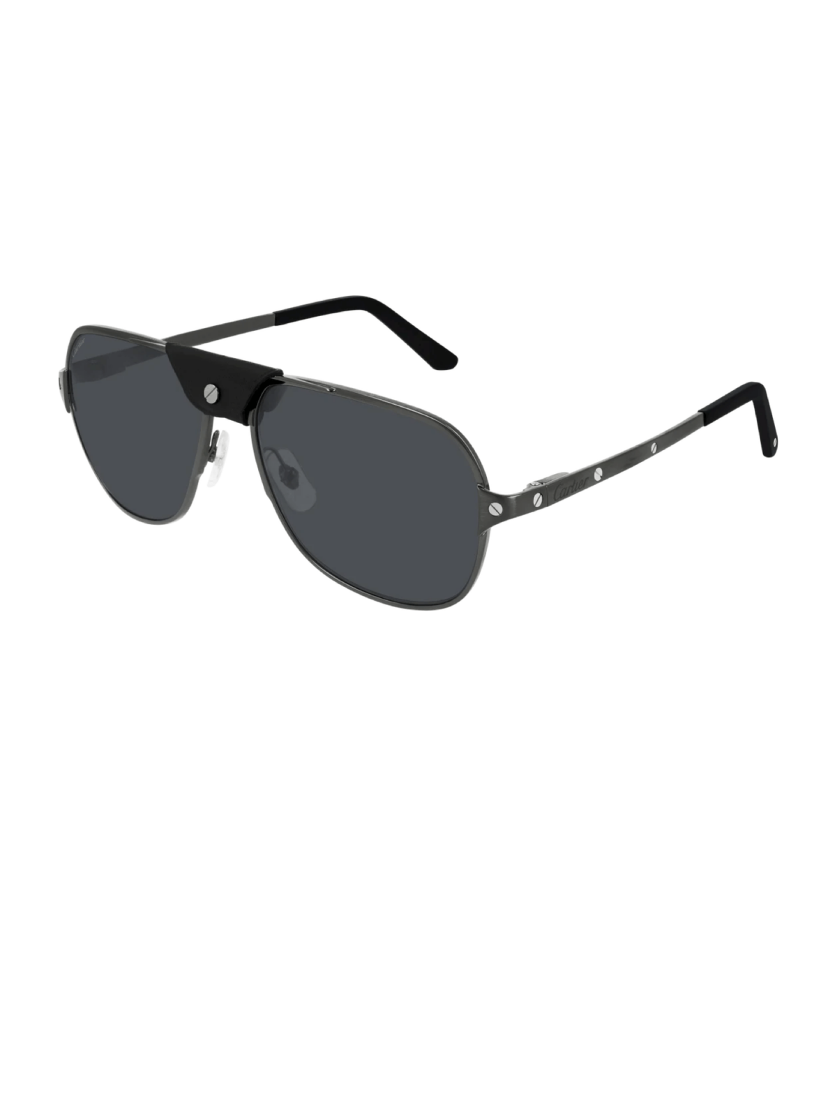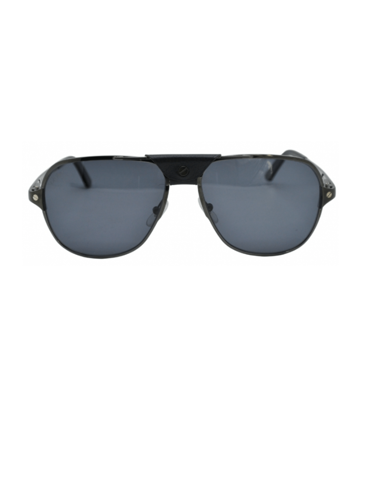 Модель в форме классического авиатора, в черном цвете оправы, с кожаным элементом на переносице, с серой линзой.