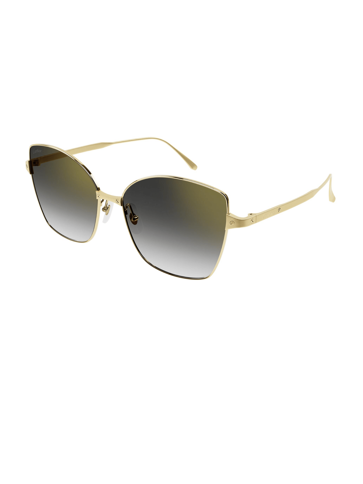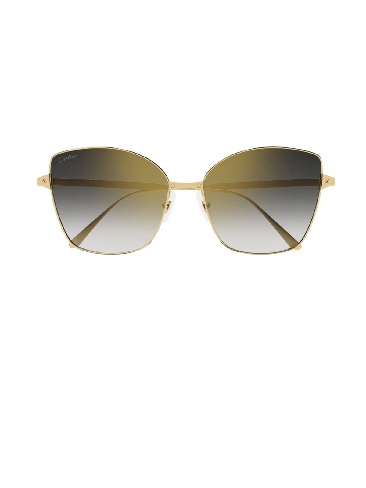 Объемная модель с вытянутыми углами с обеих сторон в золотой оправе с серой градиентной линзой.