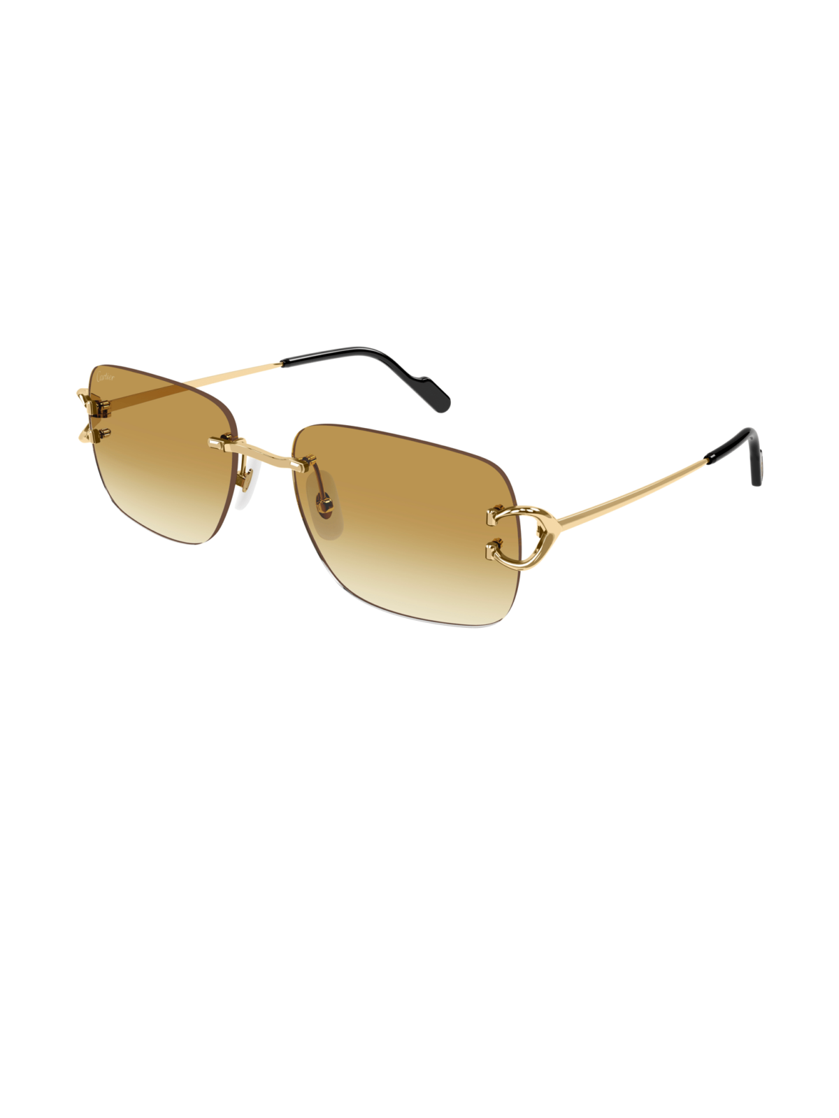 Безоправная модель от Cartier в прямоугольном силуэте, покрытие оправы желтое золото 5мм, с желтой градиентной линзой.