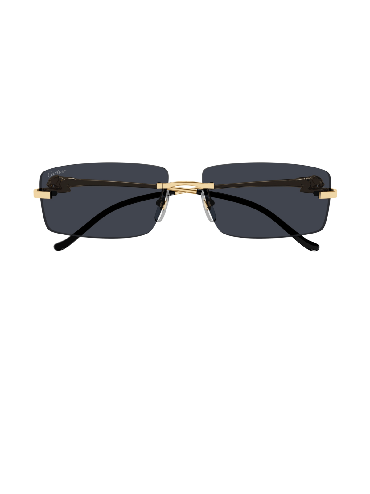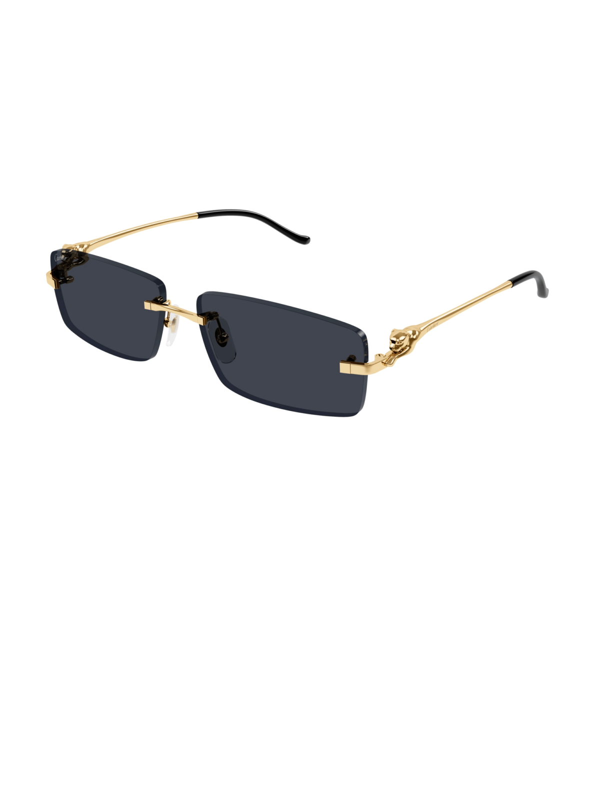 Безоправная модель, в прямоугольном, классическом силуэте, в золотой оправе, серой линзой, геометрическими пантерами на скобках.