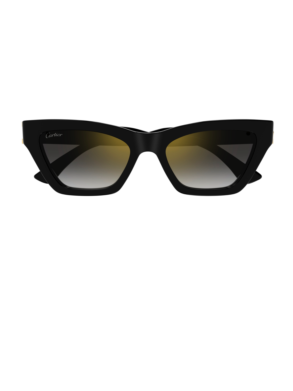 Модель в форме кошачьего глаза, оправа-пластик с золотыми вставками на скобках, с серой линзой.