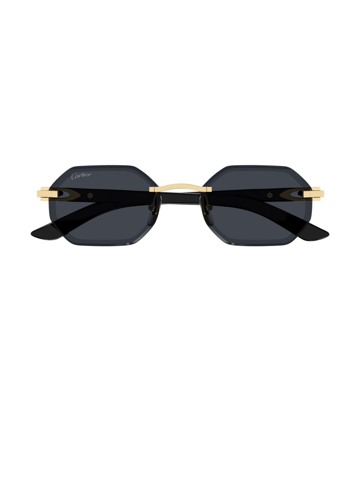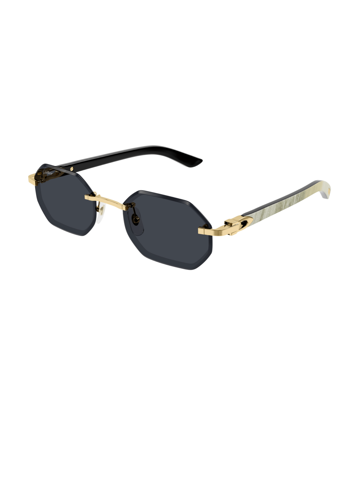 Безоправная модель, с линзой ромбовидной формы, со скосами серого цвета, фурнитура – ​​металл с золотым напылением, скобки сделаны из угла.