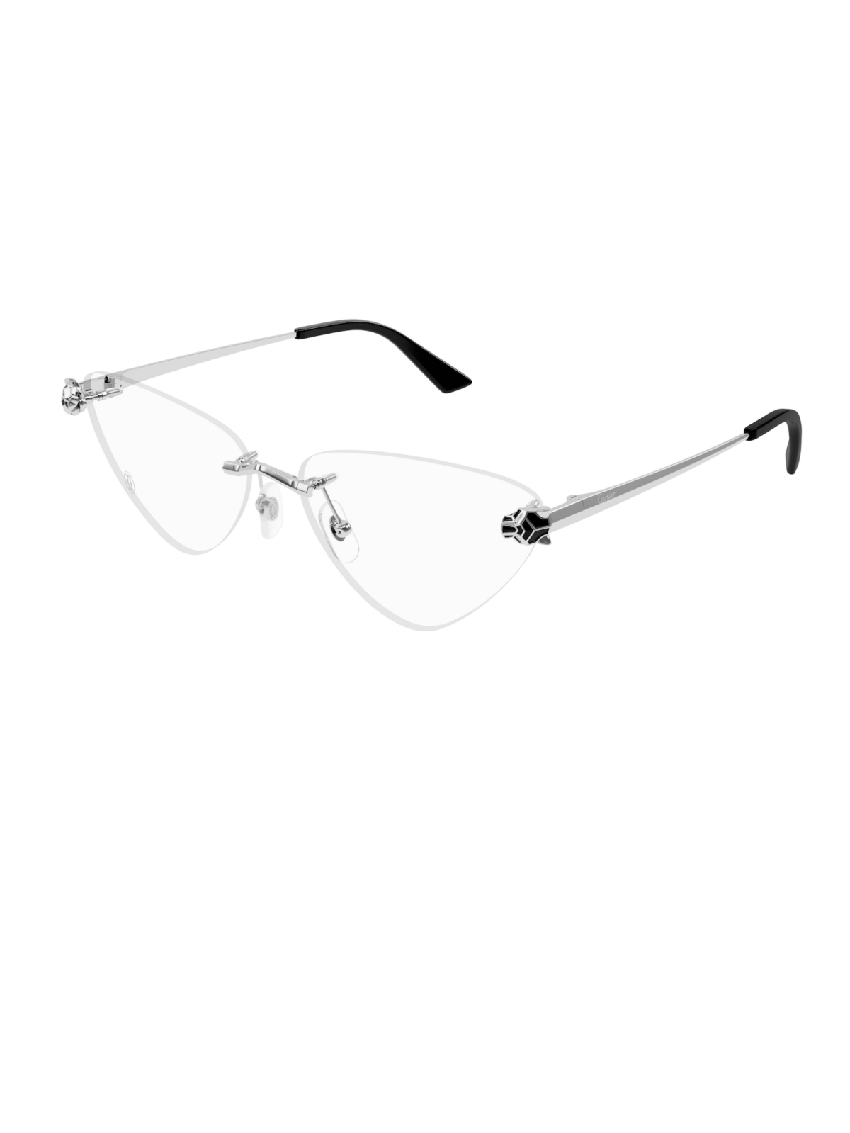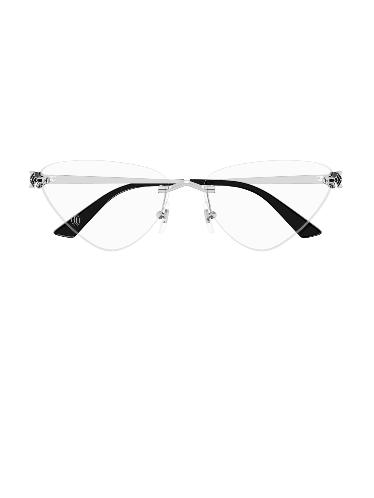 Модель имеет силуэт cat eye с тонкой металлической оправой платинового цвета. Поверхность имеет гладкое покрытие platinum finish. Дужки серебристого цвета украшены фирменным элементом в виде головы леопарда, являющейся узнаваемым символом Cartier.