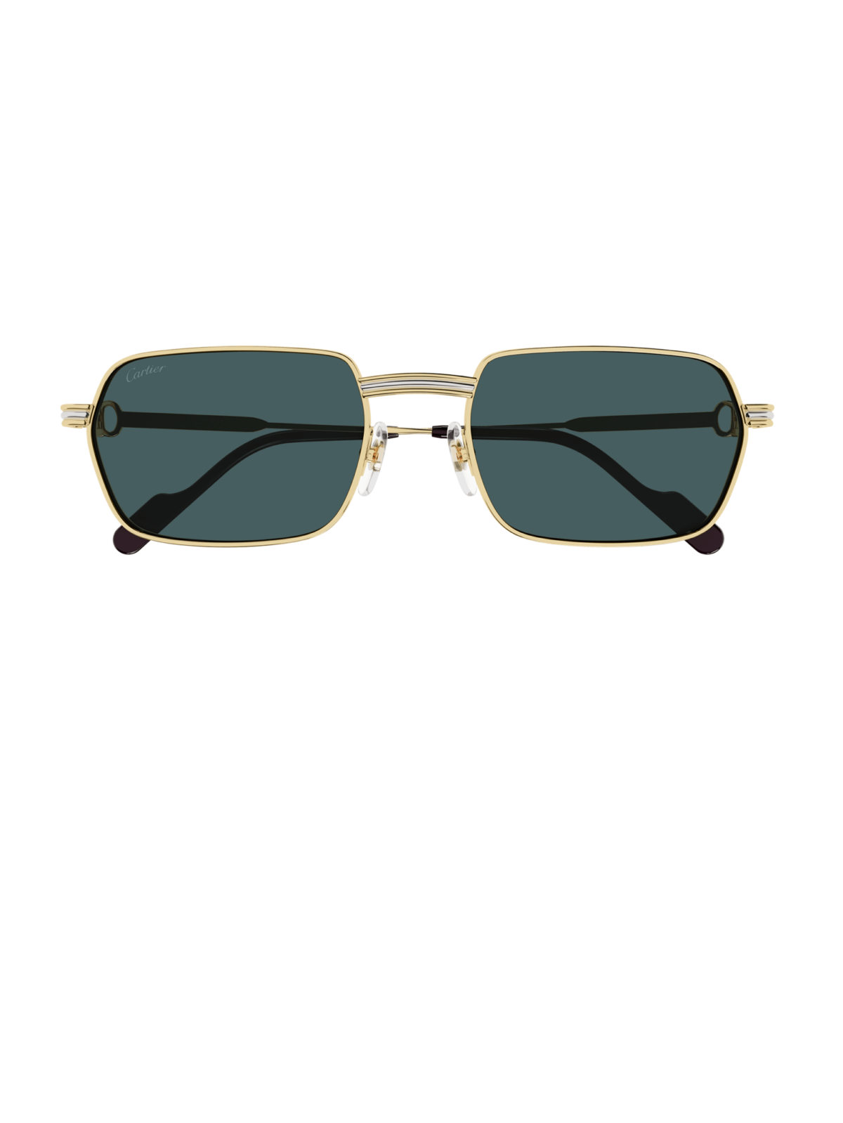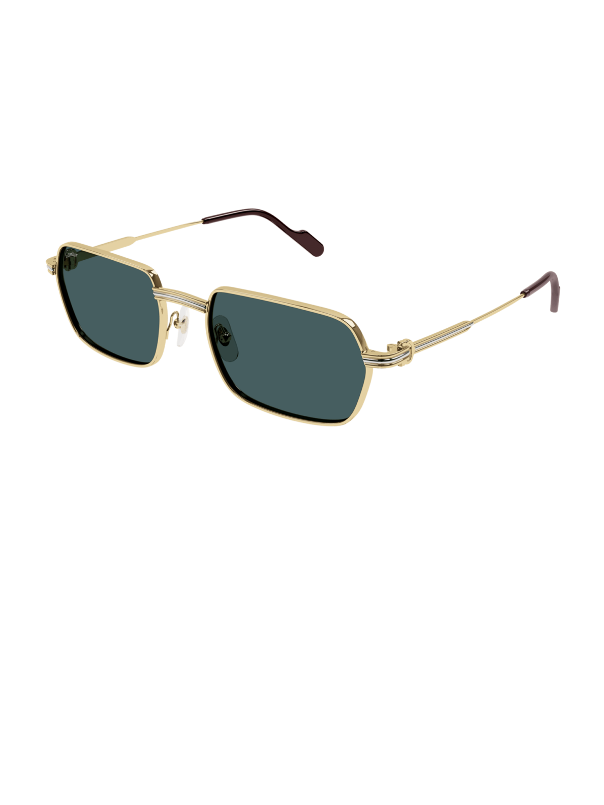 Модель в прямоугольном, классическом силуэте, в золотой оправе и зеленой линзой.