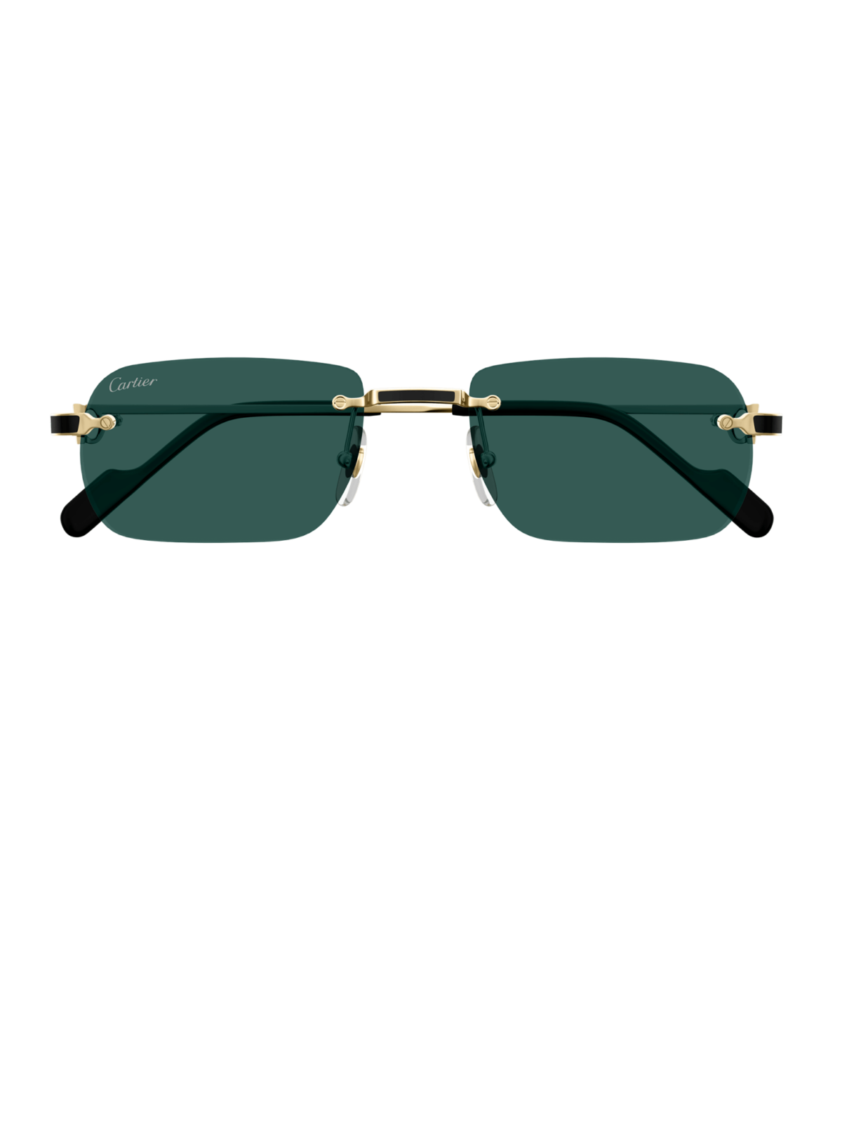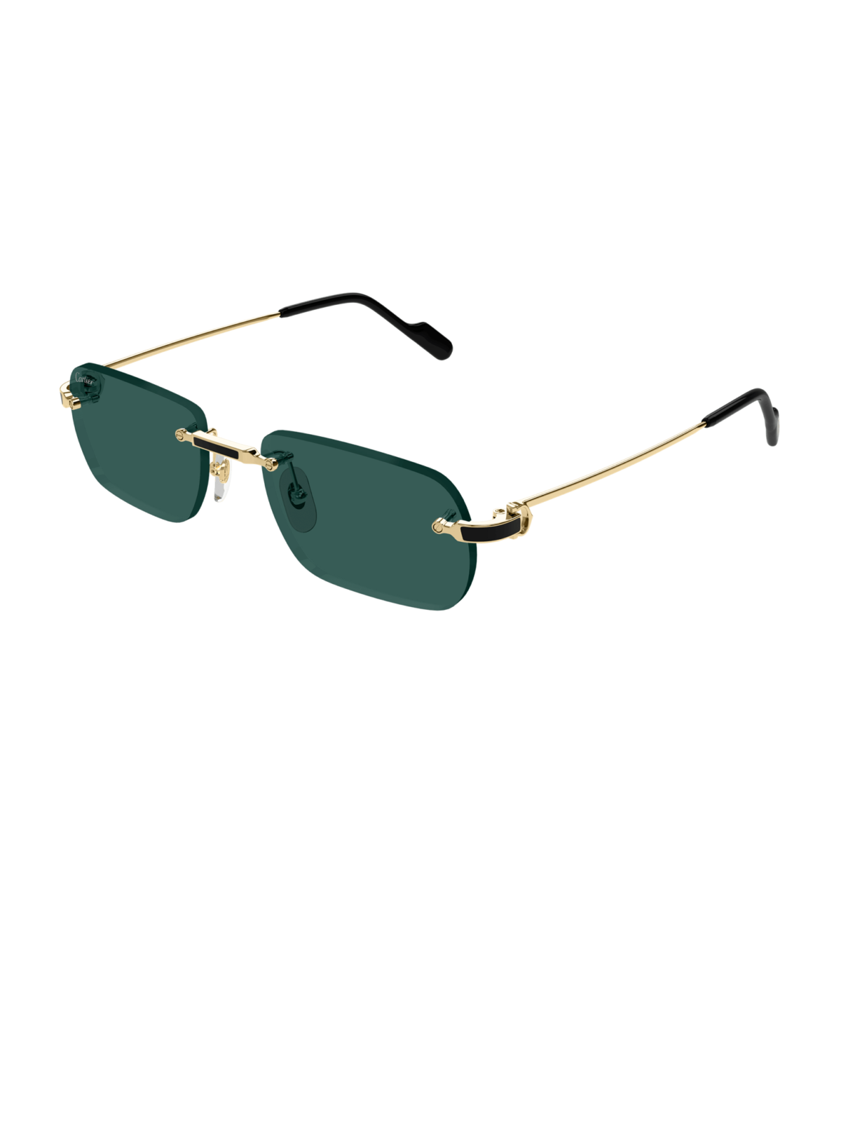 Безоправная модель в прямоугольном, классическом силуэте, в золотой оправе и зеленой линзой.