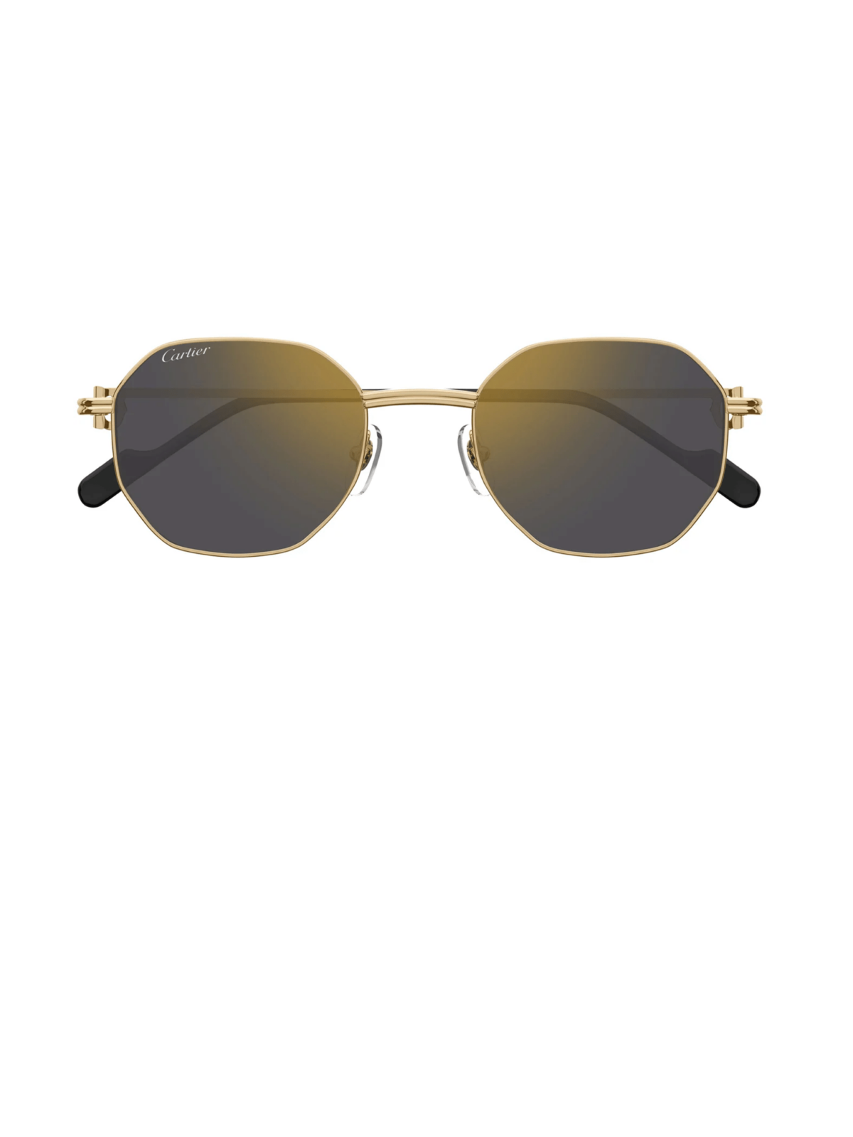 CARTIER CT0500S 001 – металлические солнцезащитные очки с мягко округлым верхом и плавно скругленными нижними краями, гладким золотым покрытием 5мм и золотыми дужками. Прямые и тонкие скобки подчеркивают элегантный силуэт оправы. Линзы серого оттенка с золотым блеском придают изящный акцент.