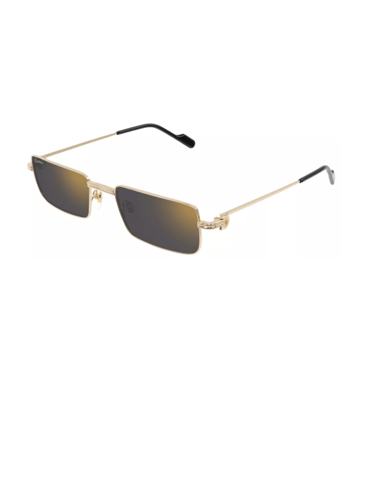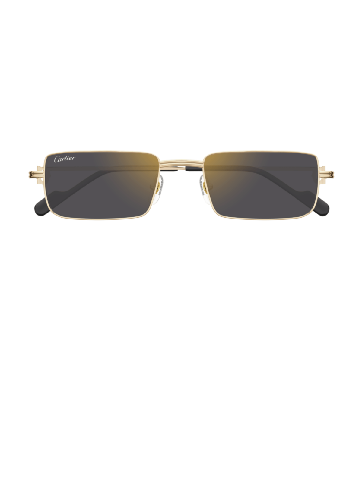 Модель в прямоугольном, классическом силуэте, в золотой оправе и серой линзой.