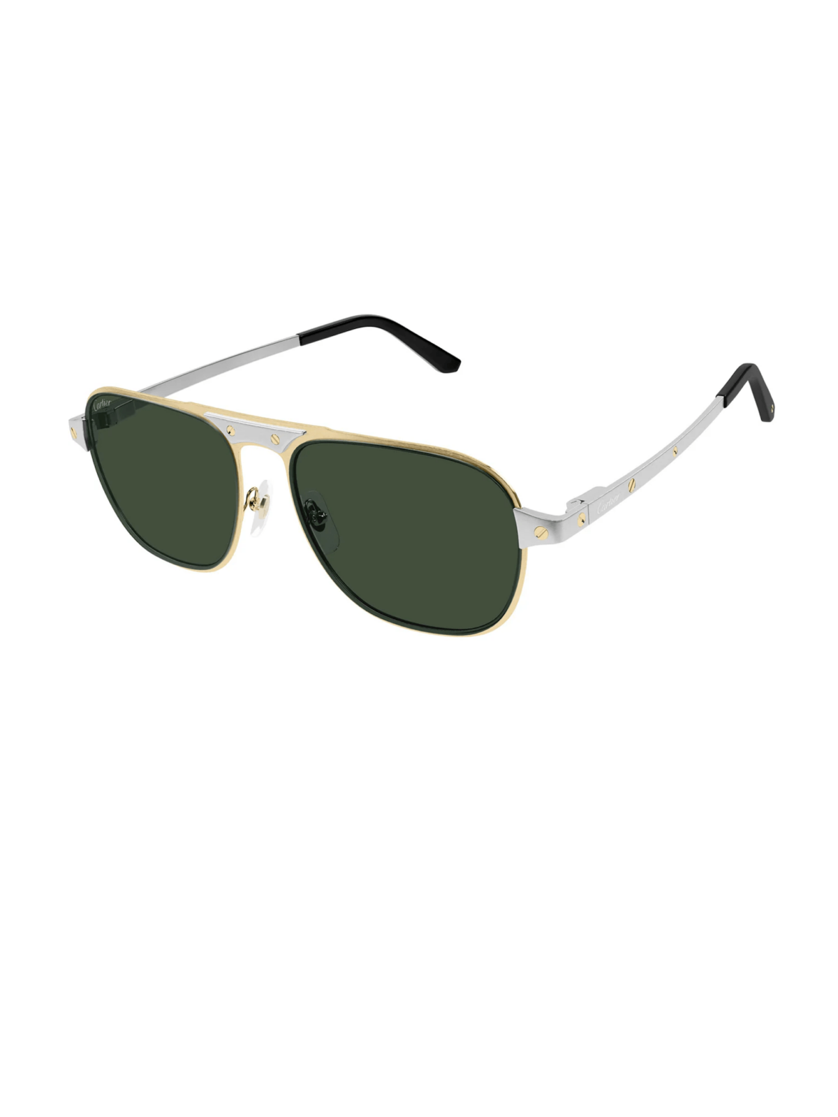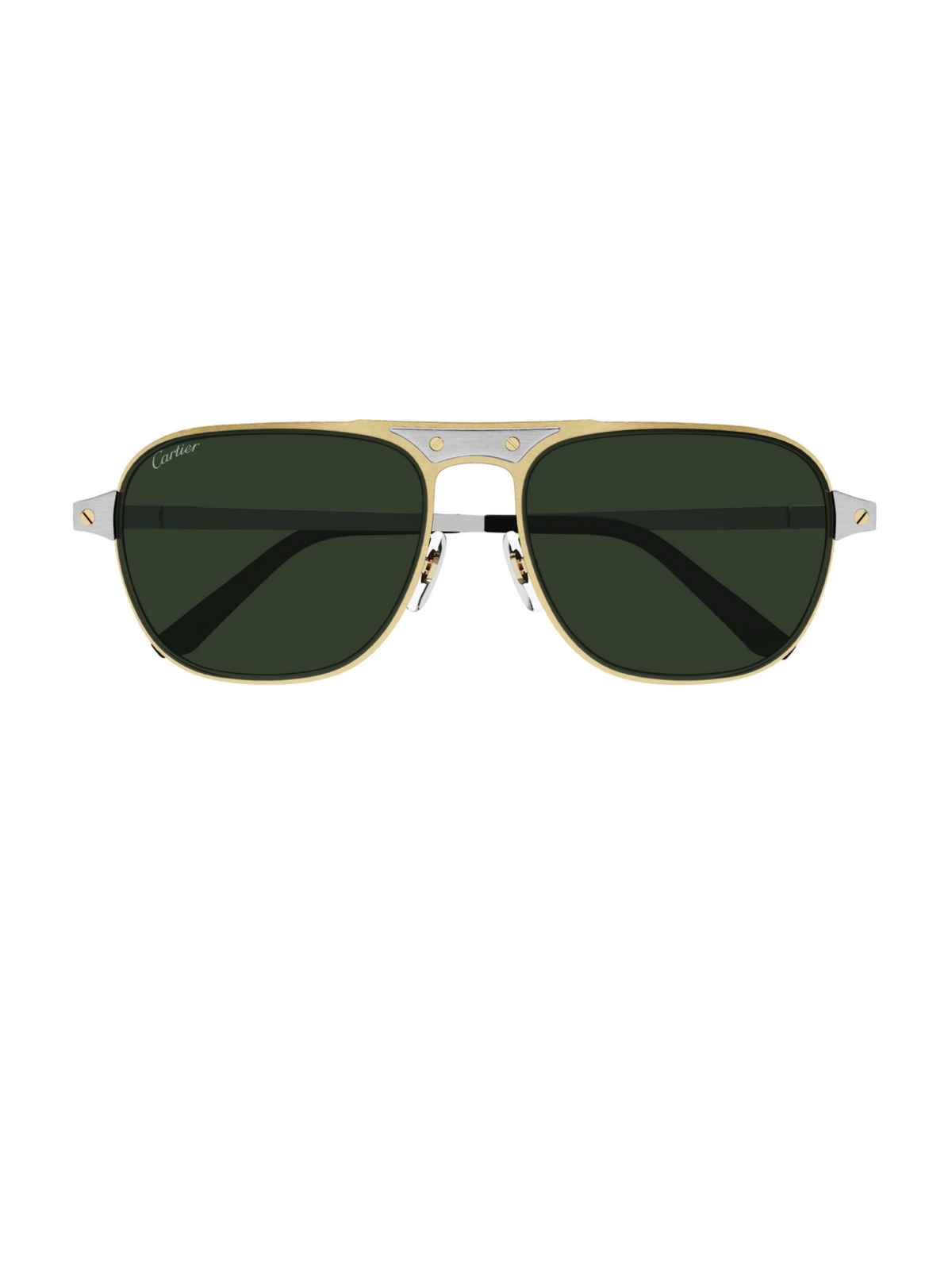 CARTIER CT0532S 002 – модель выполнена в силуэте авиатора с металлической оправой, сочетающей матовое золотое покрытие и вставку из матового платинового тона. Зеленые нейлоновые линзы подчеркивают характерный стиль и делают дизайн выразительным и элегантным.
