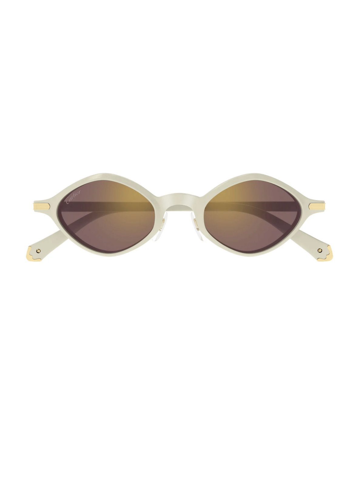 CARTIER CT0540S 005 – солнцезащитные очки с геометрической оправой цвета айвори, изготовленной из переработанного ацетата. Силуэт сочетает современность и утонченность, создавая выразительный акцент. Линзы мягкого розово-сиреневого оттенка (mauve) с золотым блеском придают образу легкости и элегантности.