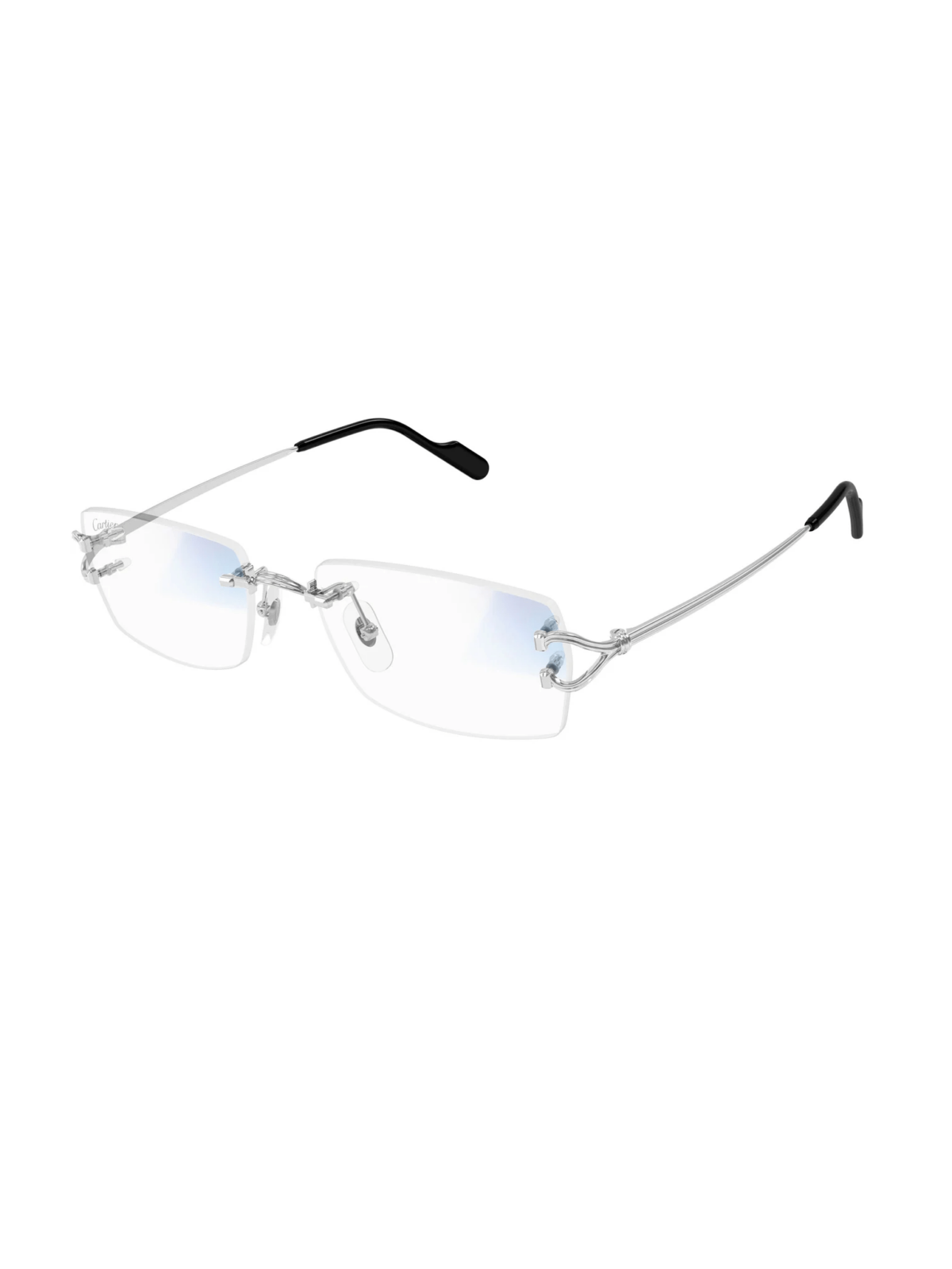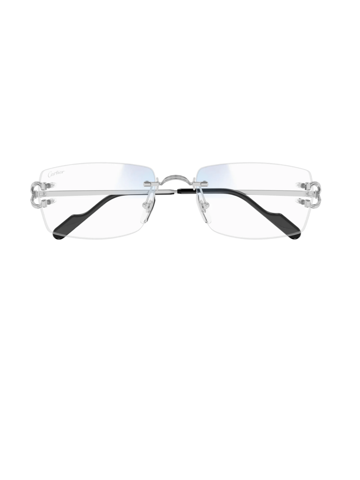 CARTIER CT0563S 001 -мужская прямоугольная металлическая оправа в гладком платиновом покрытии. Тонкие прямые скобки подчеркивают минималистичный силуэт, сочетая классику и современный стиль.
