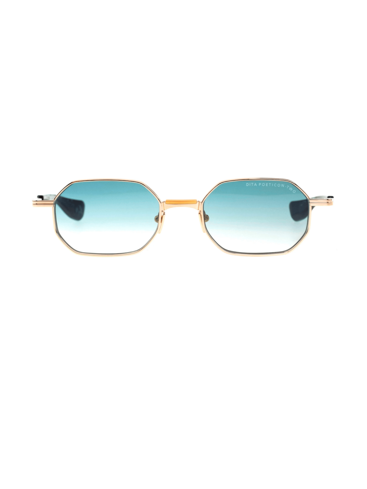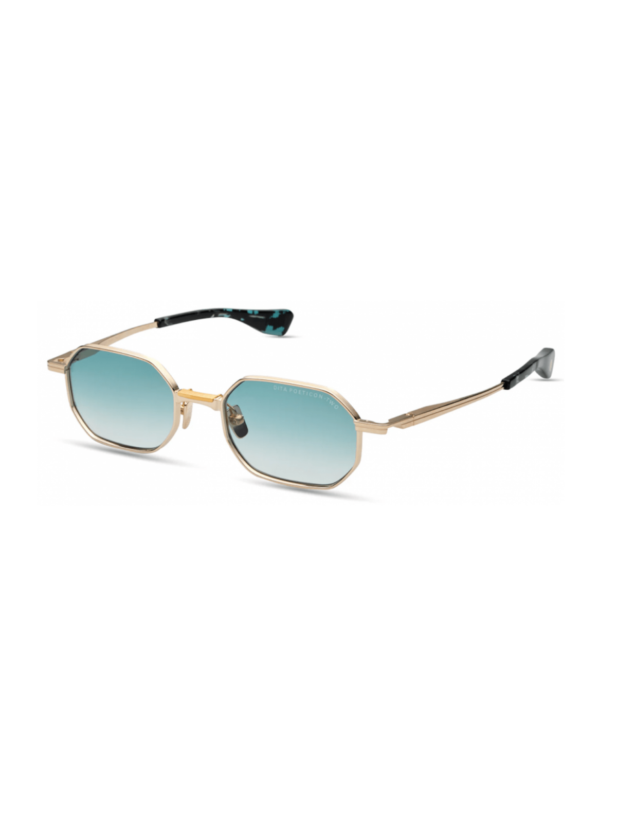 DITA DTS179-A-02 POETICON-TWO - Модель имеет восьмиугольный (октагональный) силуэт с металлическими рамками. Оправа выполнена в матовом белом золоте (matte white gold) – сочетает точность и легкость. Линзы — градиентные, с бирюзовым переходом к прозрачности (turquoise → clear), с полной UV-защитой. Носоупоры и скобки металлические, со свойственным DITA качеством и механикой сборки. Модель сделана в Японии.