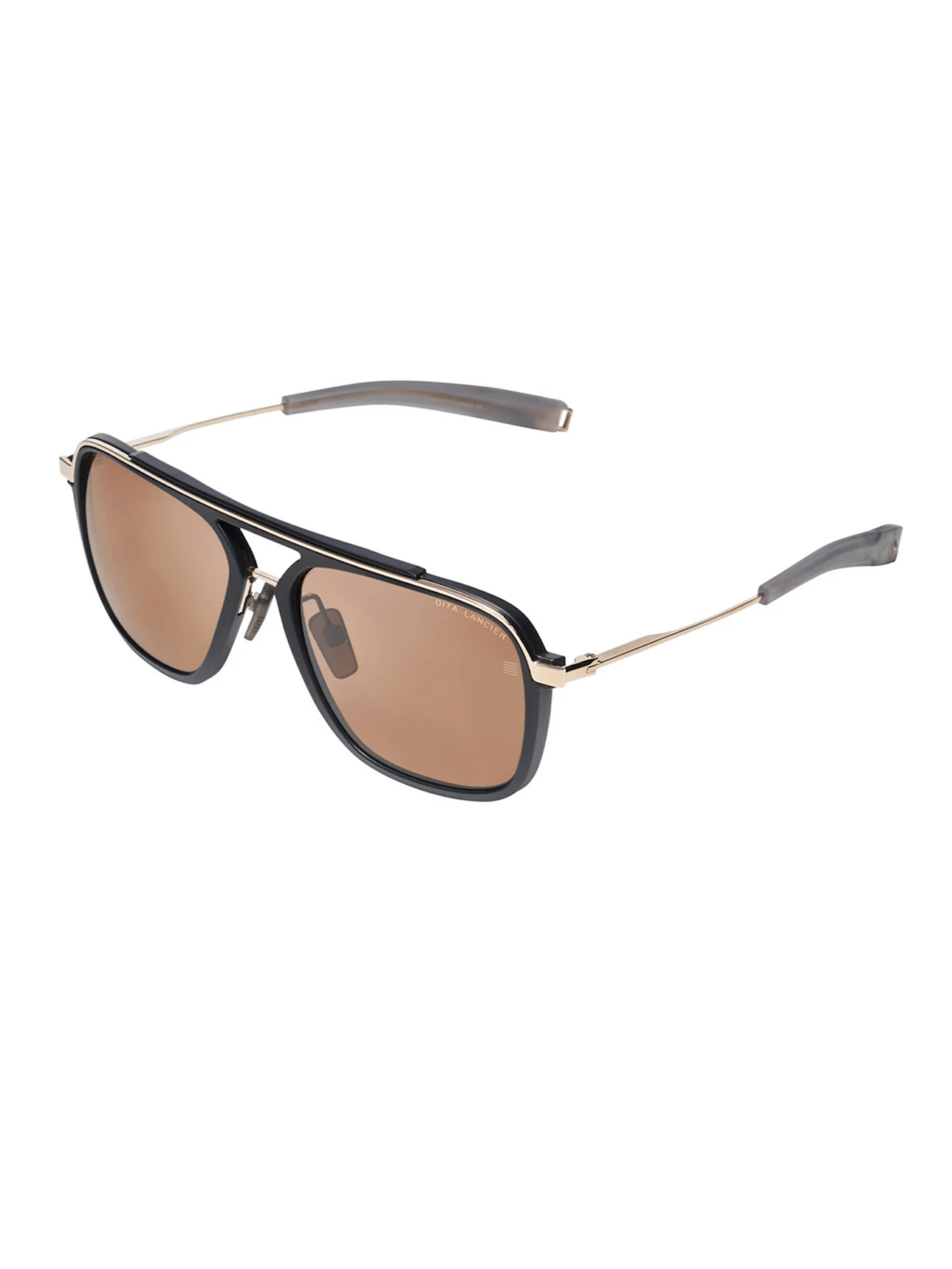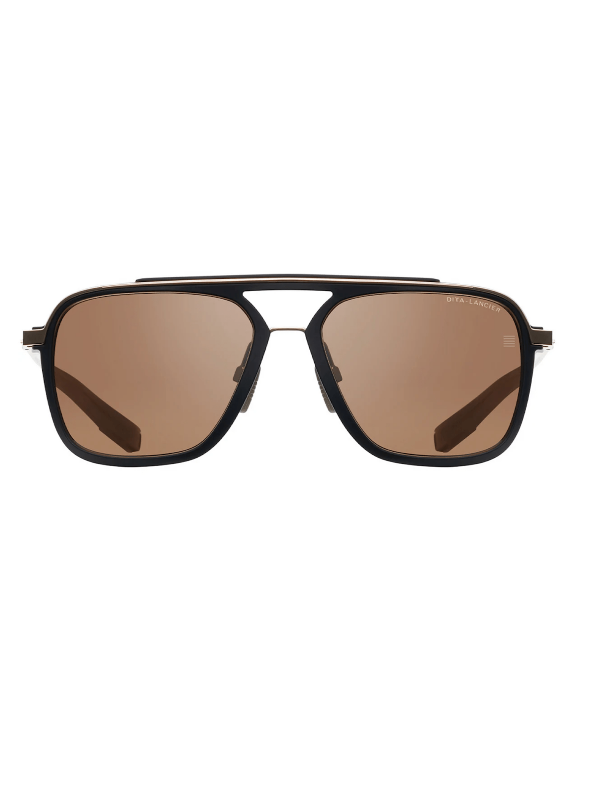 Модель имеет квадратный силуэт авиатора с двойным перекладином. Оправа – комбинация металла и ацетата, передняя часть – матово-черная, скобки – в золотистом оттенке. Линзы – коричневые, поляризованные (“Land”), обеспечивают уменьшение бликов во время движения. Носоупоры регулируемые для лучшего прилегания. Конструкция продумана для комфорта во время вождения или активного использования.