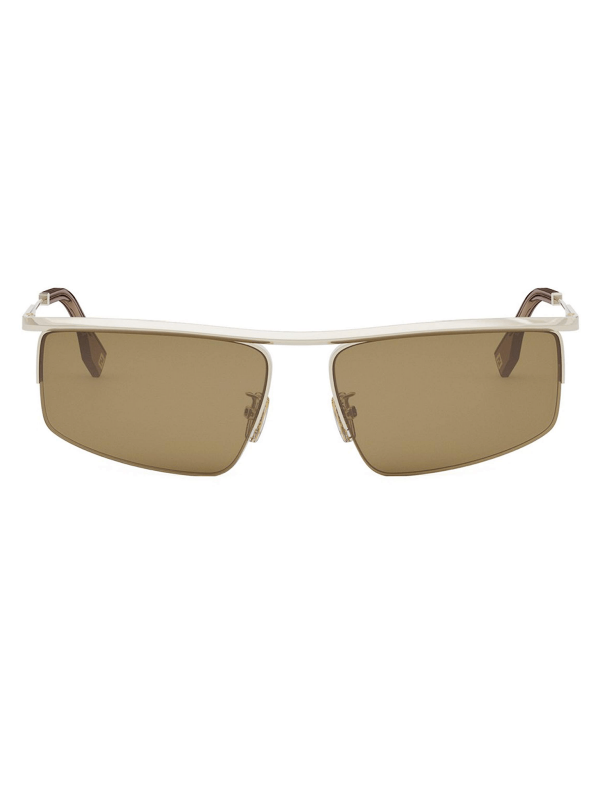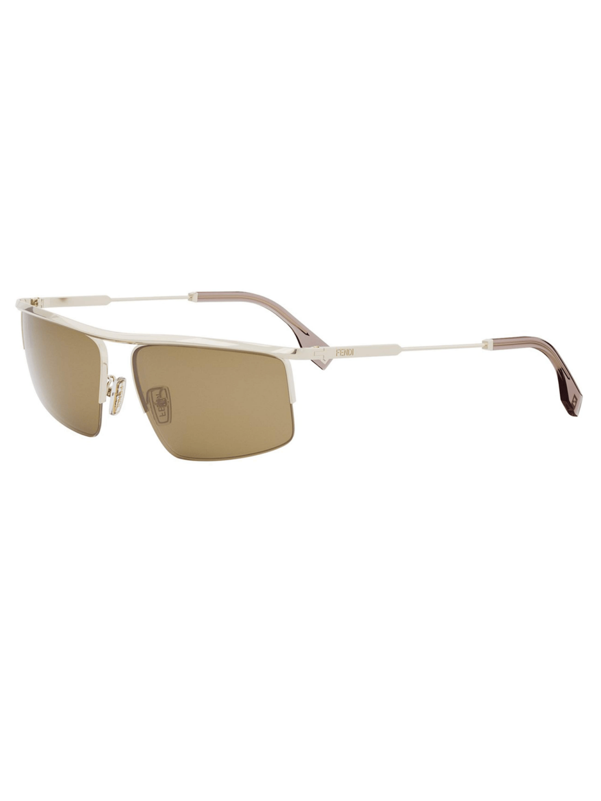 FENDI FE 40141U 32E – солнцезащитные очки с современным силуэтом маски, имеют коричневые однотонные линзы и металлическую оправу в золотом цвете.