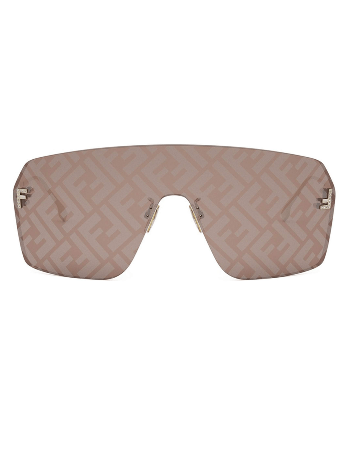FENDI FE 4121U 32E - Модель имеет силуэт маски без оправы. Линзы с зеркальным напылением, плавно переходят в тонкие золотистые дужки из металла. Металлический логотип FENDI по бокам.