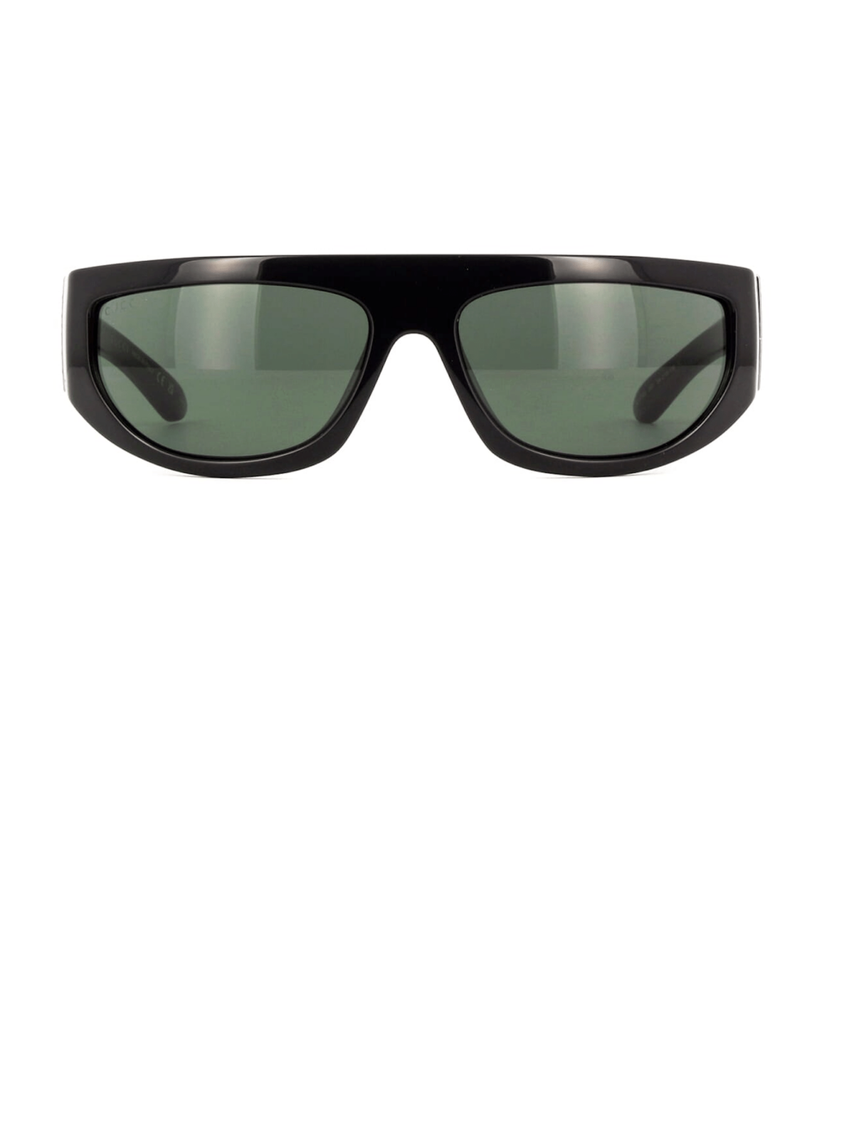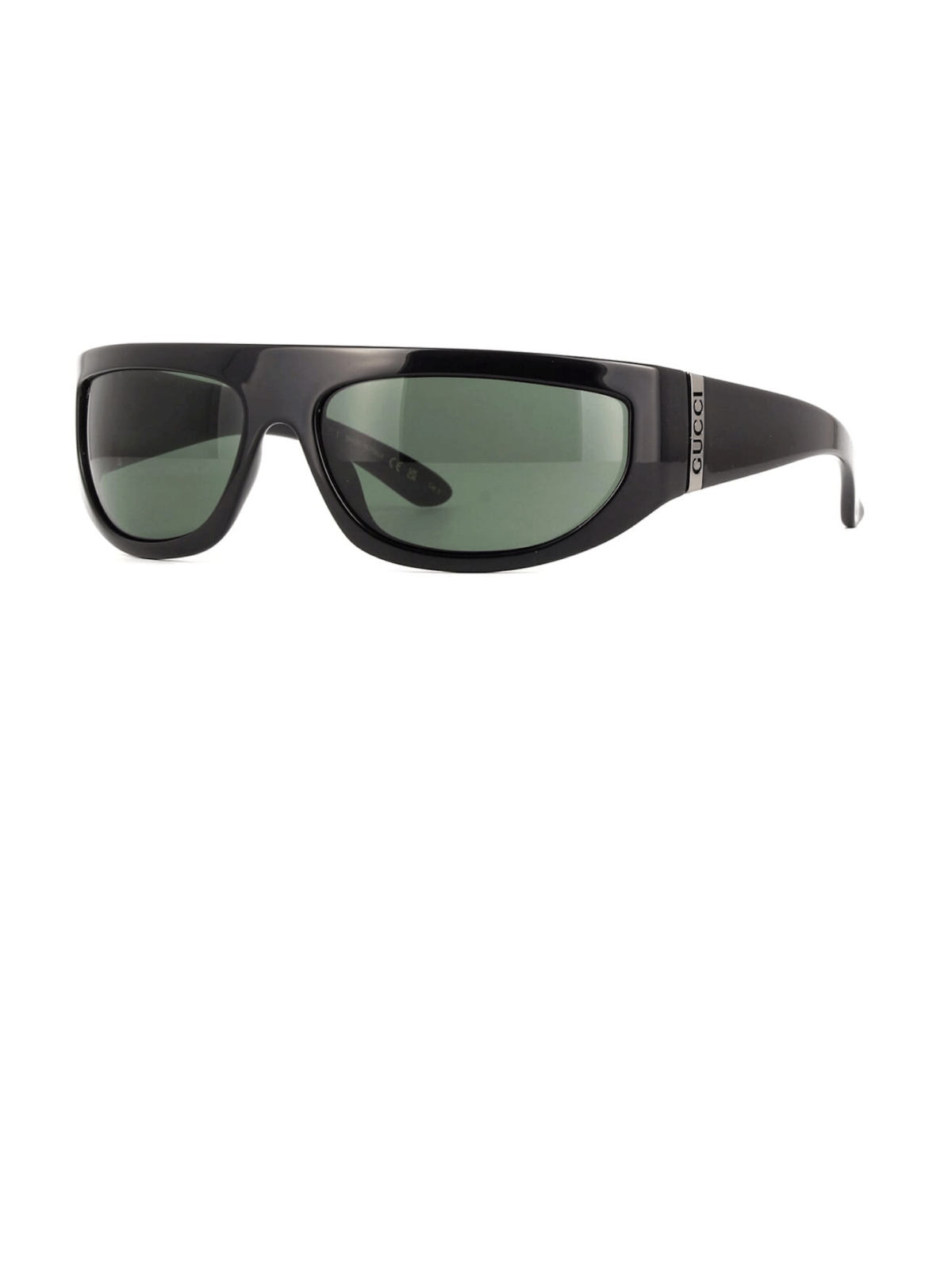 Модель имеет силуэт «wrap-around» (полнообтекаемая форма), охватывающая зону глаз и создающая современный спортивно-модный акцент. Оправа выполнена из блестящего черного ацетата. Линзы – серые, однотонные, с категорией UV-3 защиты. Материал – пластик/ацетат.