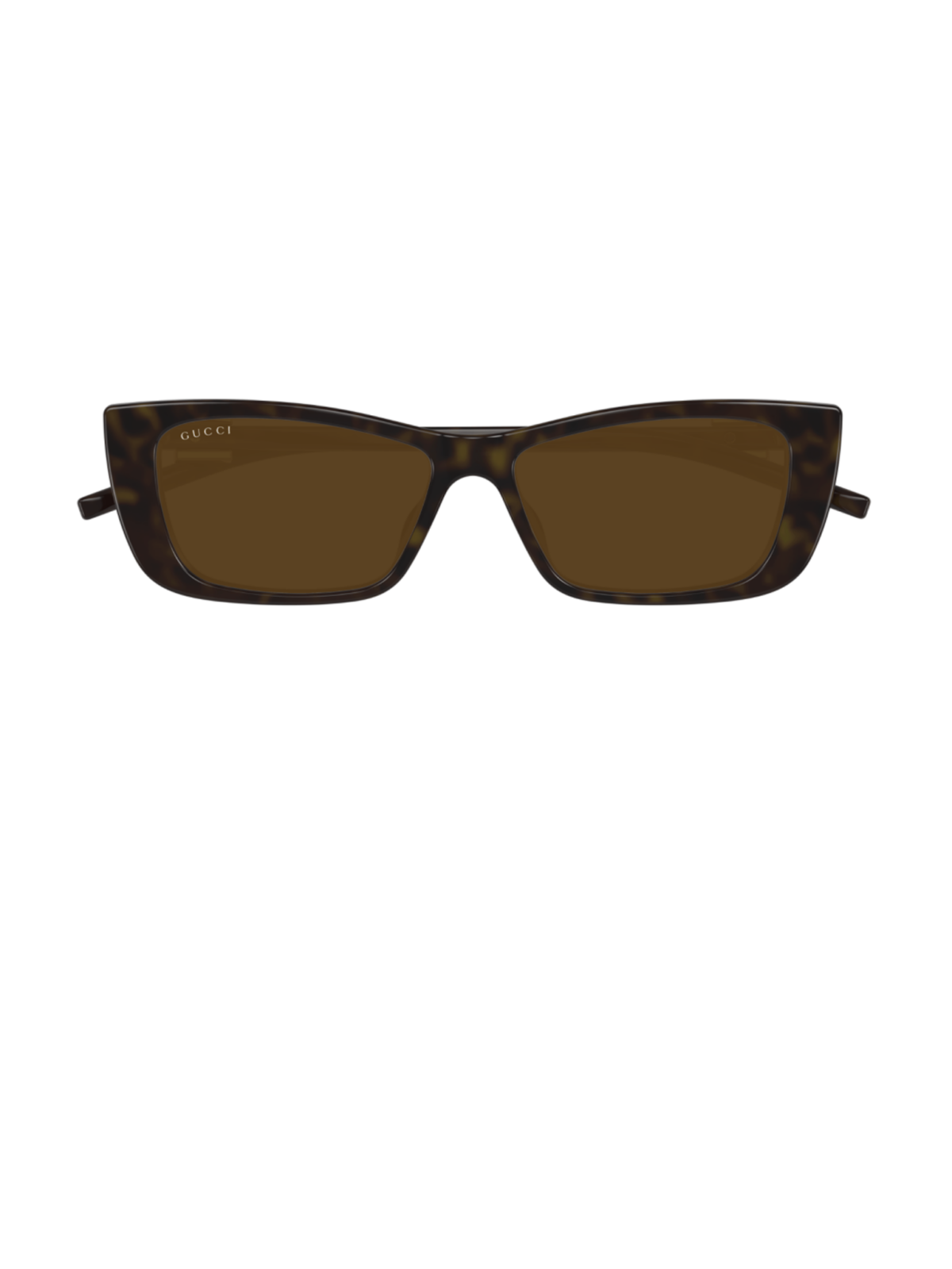 Модель имеет силуэт cat-eye с прямолинейными верхними краями и мягко приподнятыми наружными углами. Оправа выполнена из гаванового ацетата (havana) с полностью ободочной конструкцией. Линзы коричневого оттенка. Скобки средней толщины, без чрезмерного декора, акцент на чистой линии.
