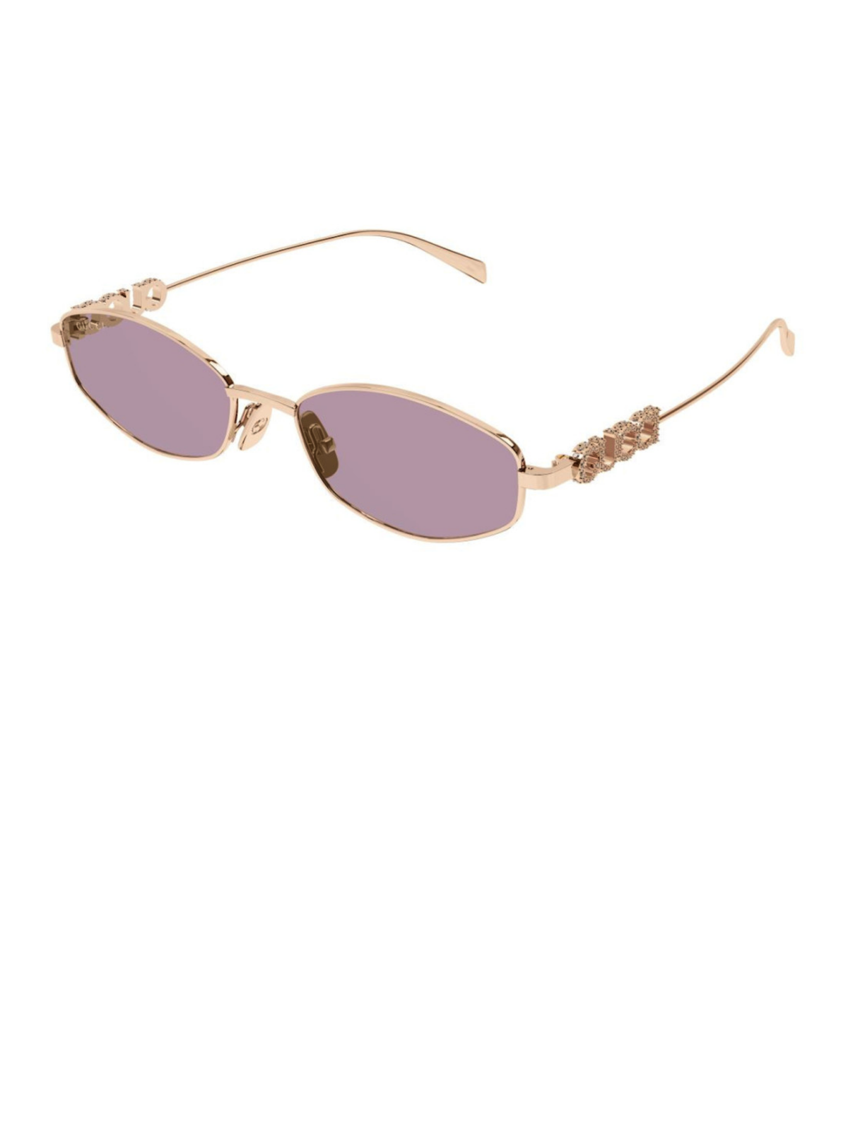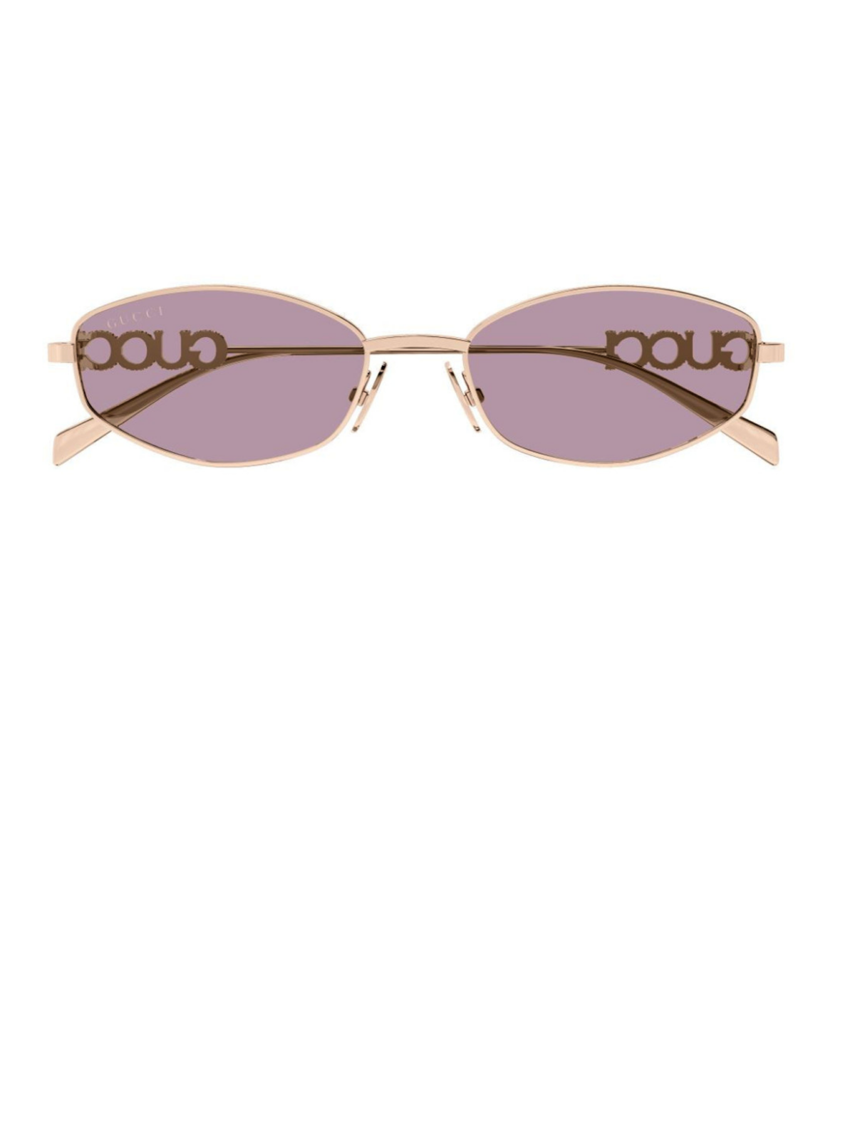 Модель имеет геометрический силуэт с мягко закругленными линзами. Оправа выполнена из металла теплого золотистого оттенка, придающего изделию сдержанного блеска. Линзы розового цвета с легким зеркальным эффектом. Тонкие скобки с гравировкой GG подчеркивают современный и лаконичный дизайн.