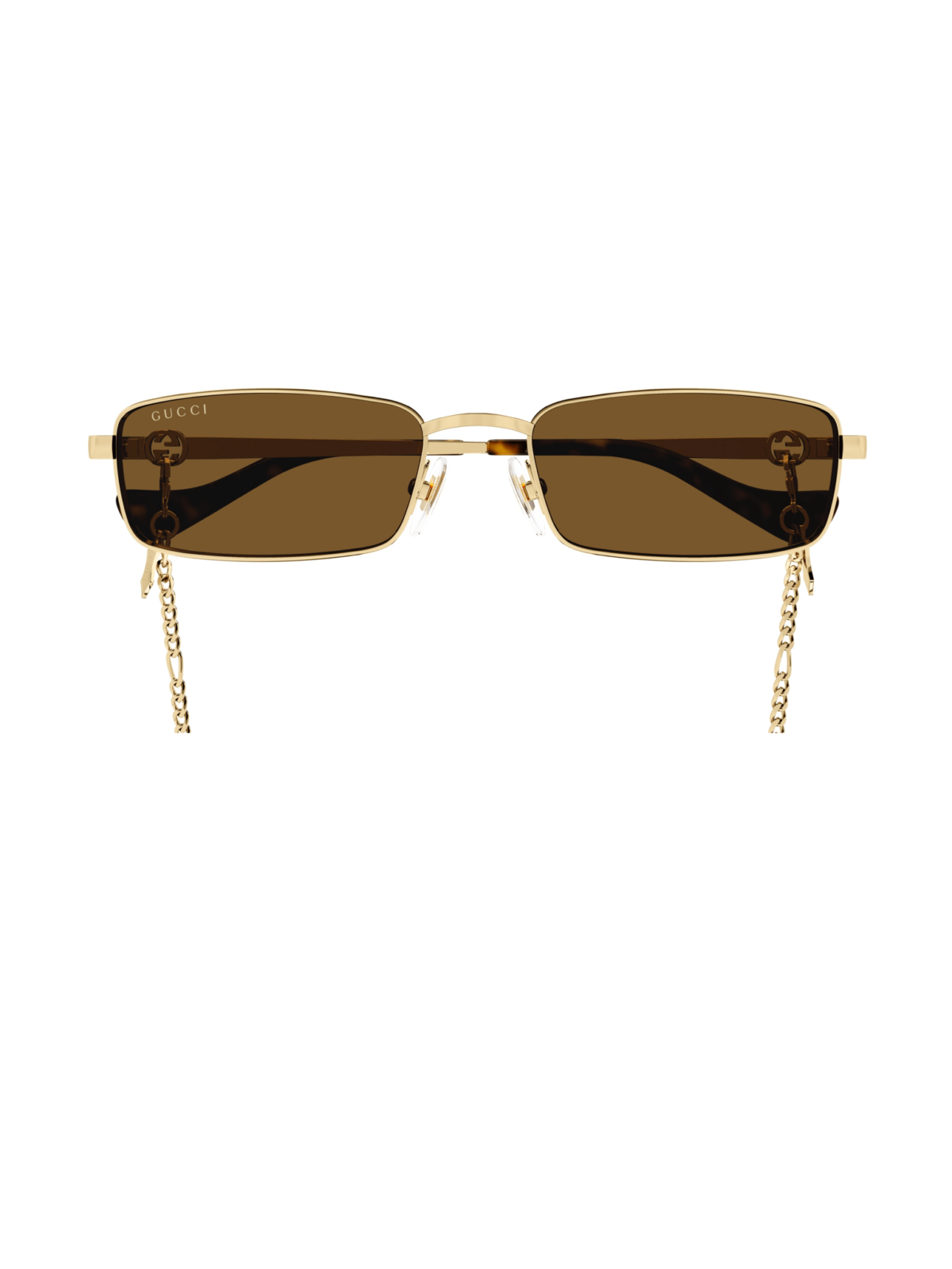 Модель классической, прямоугольной формы, в металлической оправе цвета лимонного золота, с серой линзой и цепочкой которая снимается.