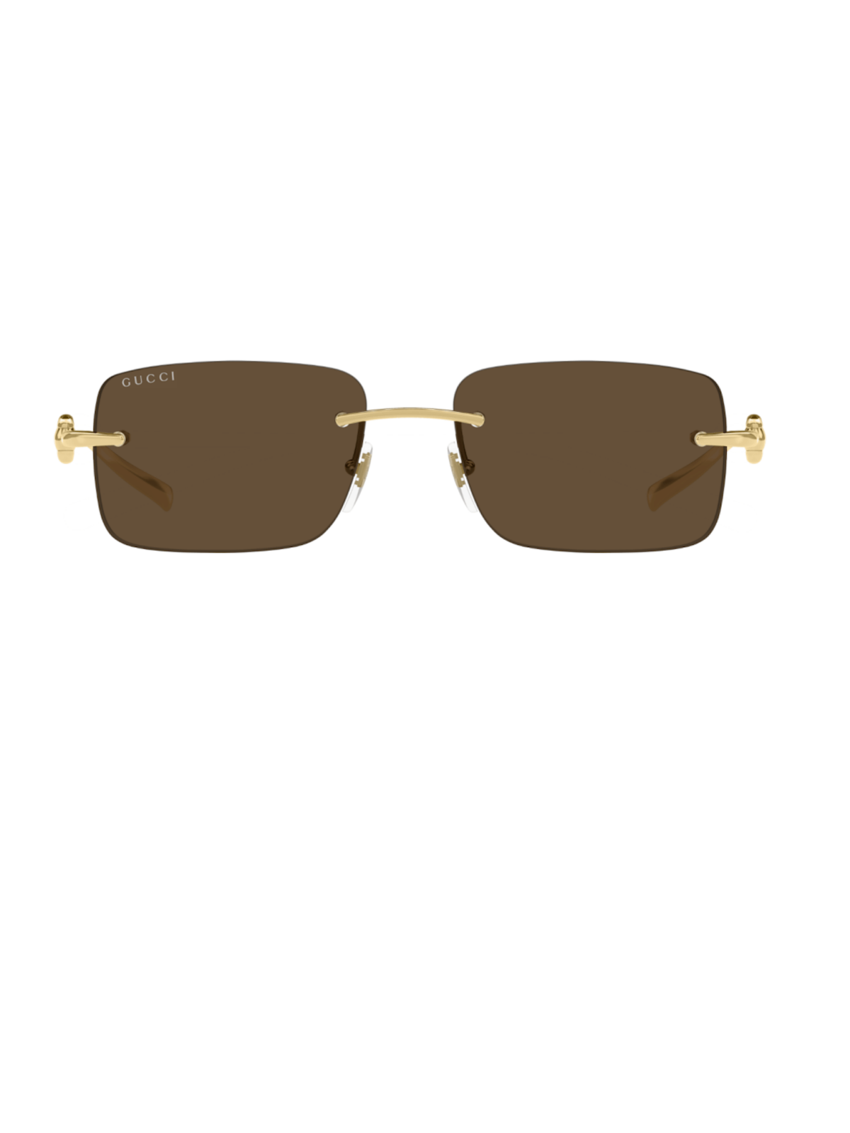 Безоправная модель от Gucci, фурнитура – ​​металл золотого цвета с коричневой линзой.