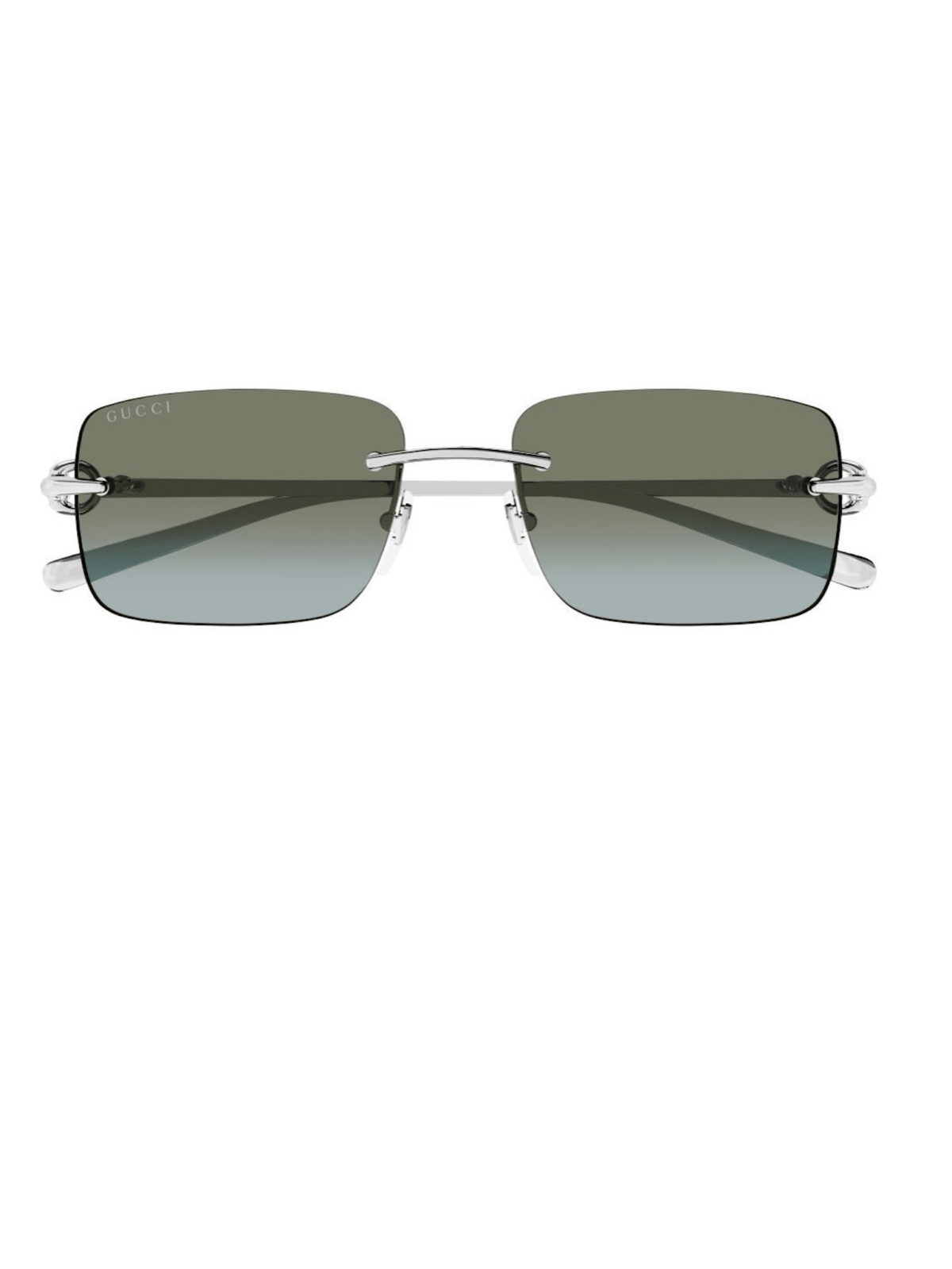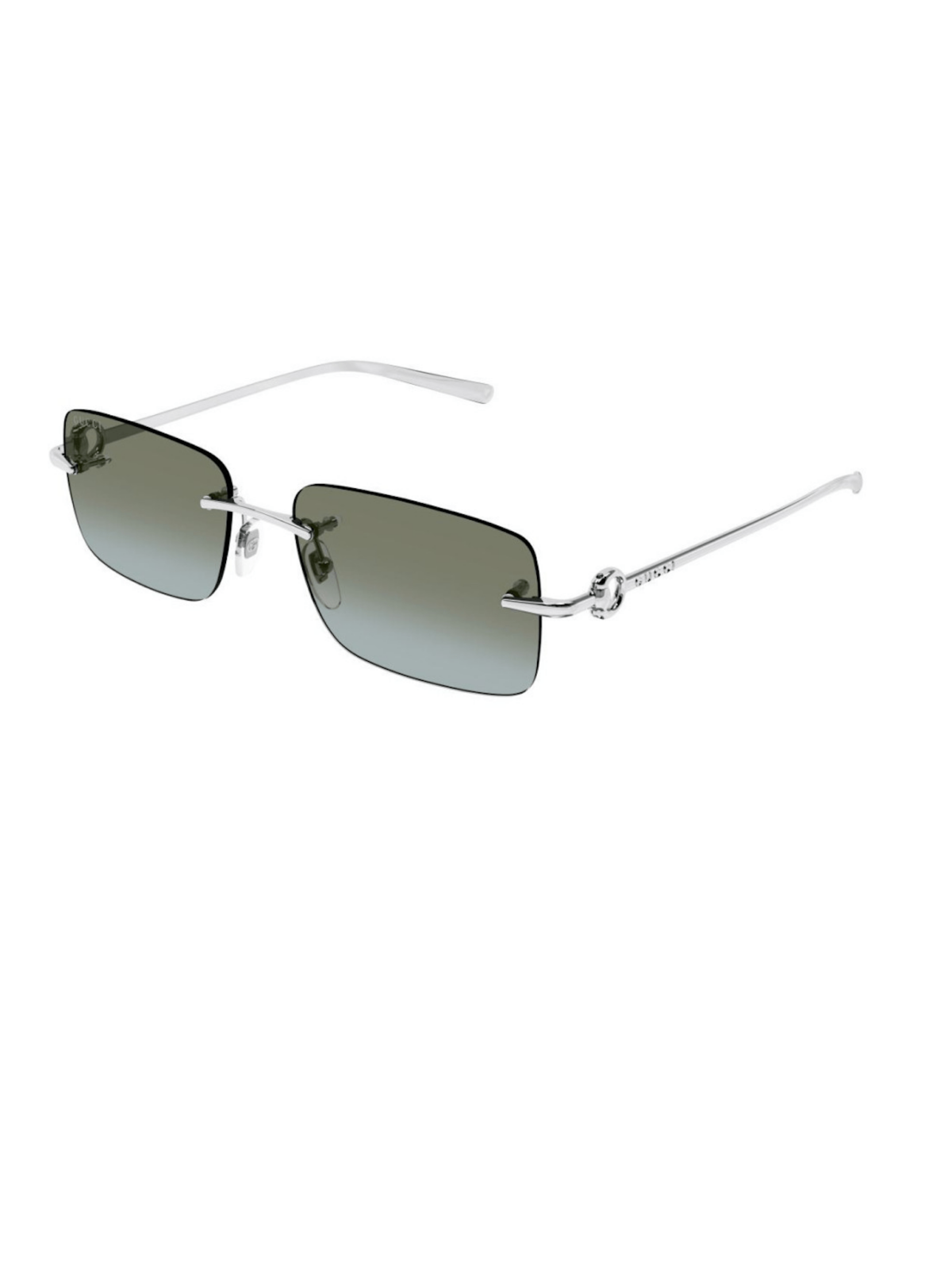 Безоправная модель от Gucci, фурнитура – ​​металл серебряного цвета с зеленой градиентной линзой.